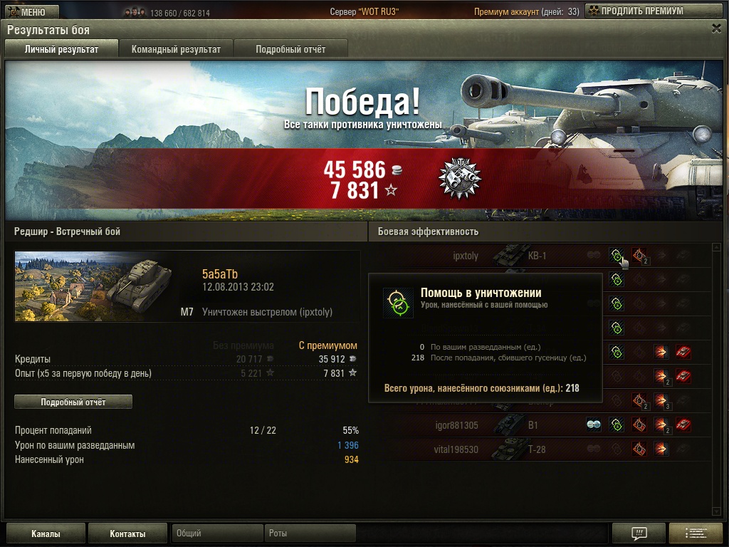 Большое спасибо.Но по данной ссылке (Вопросы разработчикам 9) я не могу опубликовать свой вопрос за неимением достаточного количества сообщений, как я понял , поэтому может все таки кто-нибудь ответит, если знает будет ли введена медаль из раздела "Герой битвы" за дамаг нанесенный союзниками по моему "гуслению" и когда ? А вообще очень был рад, когда ввели получение очков за "гусление" и затопление противника , спасибо ОГРОМНОЕ за это разработчикам! Из пожеланий хотелось бы, если этто вообще реально что бы ввели, допустим, получение очков за засвет игрока, после того как вы сломали домик, за которым он прятался или например (по личному примеру) : я загуслил Т-34 (прем. ТТ 8 ур, США) когда он ехал в Малиновке по берегу (не через болото) от коровников и после того как я снял с него гуслю его развернуло так что он , стоя на моей гусле просто сполз в воду и утонул :) , было обидно ,что полезное действие совершил , но ничего за это не получил...