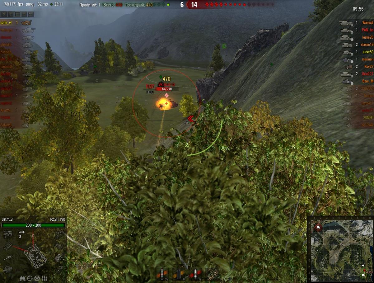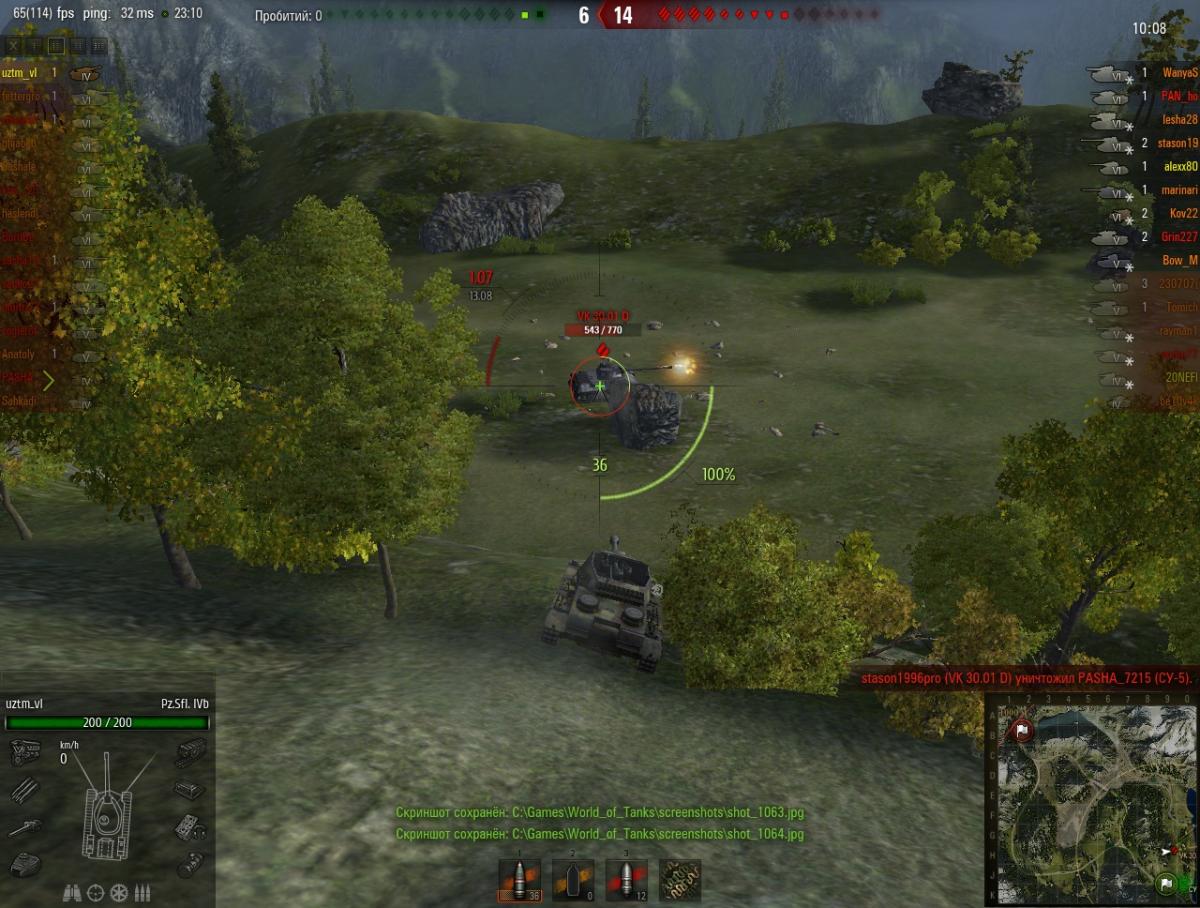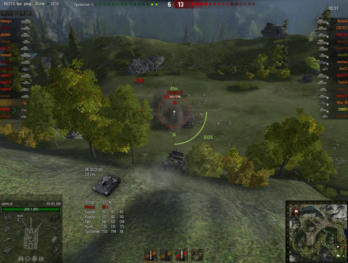 Вот пока самый удачный выстрел. Пробитие на 470 хп плюс пожар. Итого 543 хп. 1 выстрелом. В ПТ-режиме. Было бы больше, но VK 30.01D приехал уже покоцаный. Коммент. Сыграли бездарно. В концовке остался против толпы красных, включая 4 тяжа. VK 30.01D бодро поехал на захват. И тут я его с горочки, сверху. Позиция для расстрела идеальная. Первый выстрел прямой наводкой - мимо!!!! Вторым забрал. Интересно, если бы он был неповрежденный, удалось бы с пожаром 770 хп снять?