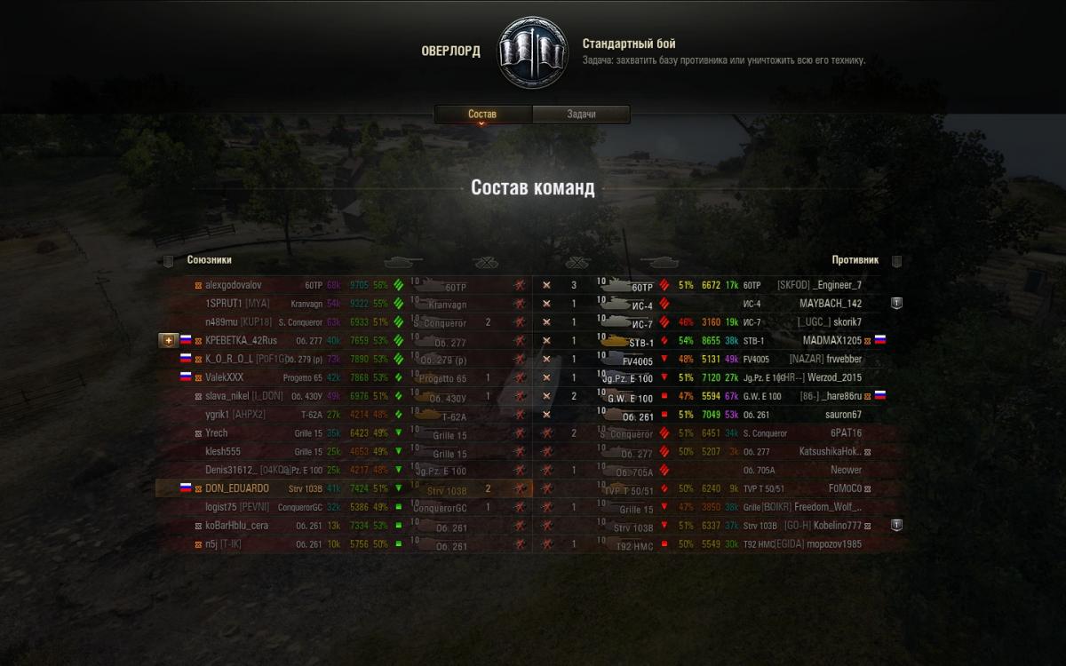 http://cdn-frm-eu.wargaming.net/4.5/style_images/wg/snapback.pngDON_EDUARDO (14 окт 2018 - 02:04) писал: УРААААА....Я СНЯЛ ЗВЕЗДУ....ЦА в 12 БОЕ...БалансиР Е.....ЫЙhttp://cdn-frm-eu.wargaming.net/4.5/style_images/wg/snapback.pngDON_EDUARDO (15 Окт 2018 - 00:04) писал: Продолжение : Сегодня с 11 боя снял звезду.....а забыл сказать- -звезду получается снять когда у нас преимущество в "зелено-синих", а не наоборот....а чтобы равное количество игроков по мастерству я такого еще не видел !!!!-Продолжение:....Все это уже закономерность?!... Или действительно не игра, а *** стала....сегодня в 13 бою снял звезду....играя опять же на одном и том же танке все бои в подряд.....