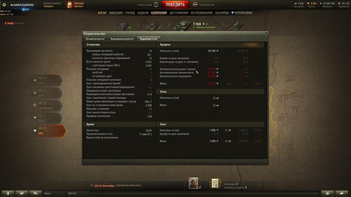 Добрый вечер Возник вопрос из-за ситуации, которая у меня произошла в крайнем бою. Взято ЛБЗ сау-15 на т55а (для выполнения с отличием) Согласно результатам боя - условия выполнены, но выполнение ЛБЗ (часть с отличием) не засчитана. Основная часть была выполнена ранее. Прошу указать где я ошибаюсь или помочь торжеству справедливости, спс. Ссылку на реплей и результаты боя прикладываю реплей - http://wotreplays.ru/site/11958791#nebel_burg-archahreji-ob_ekt_261