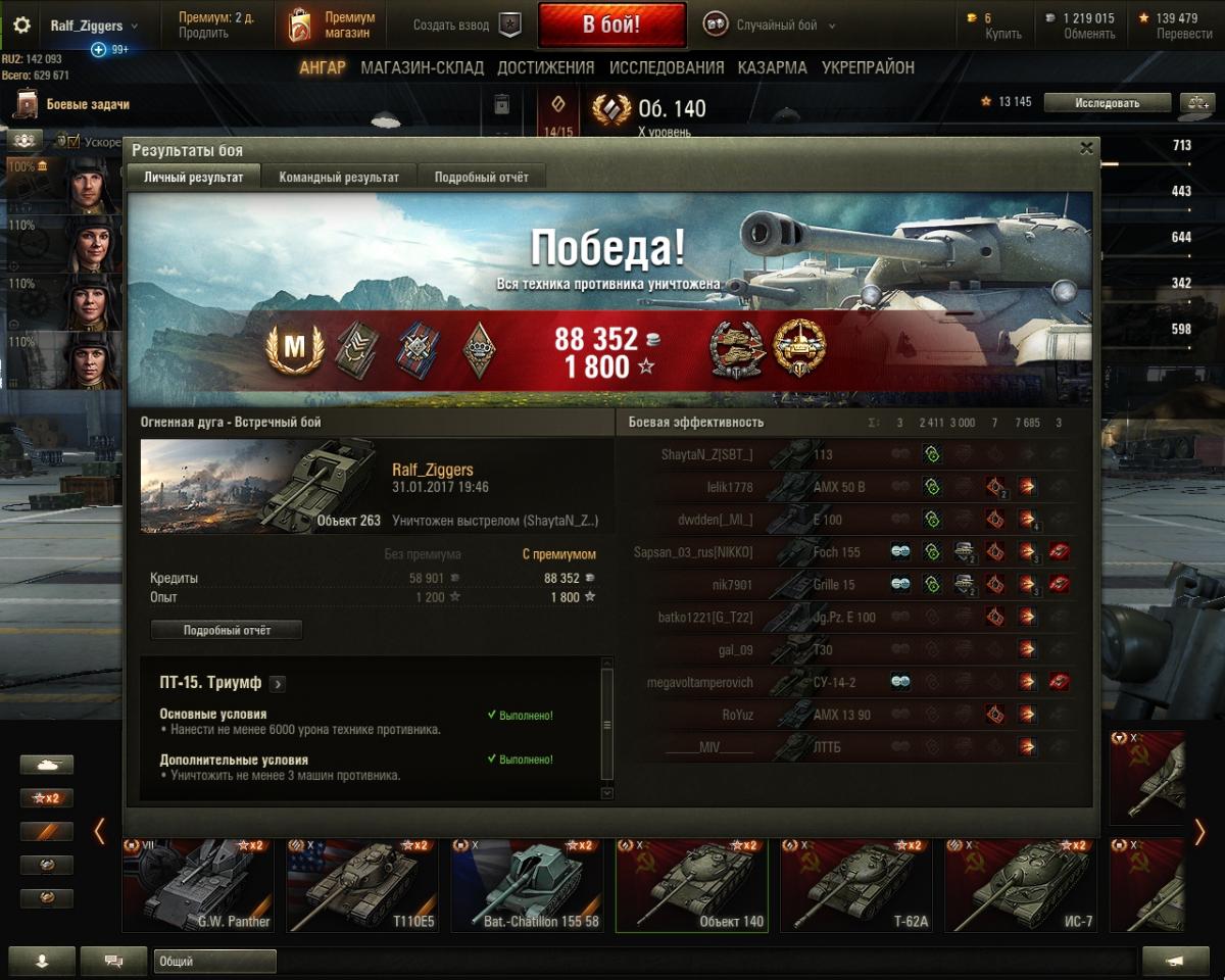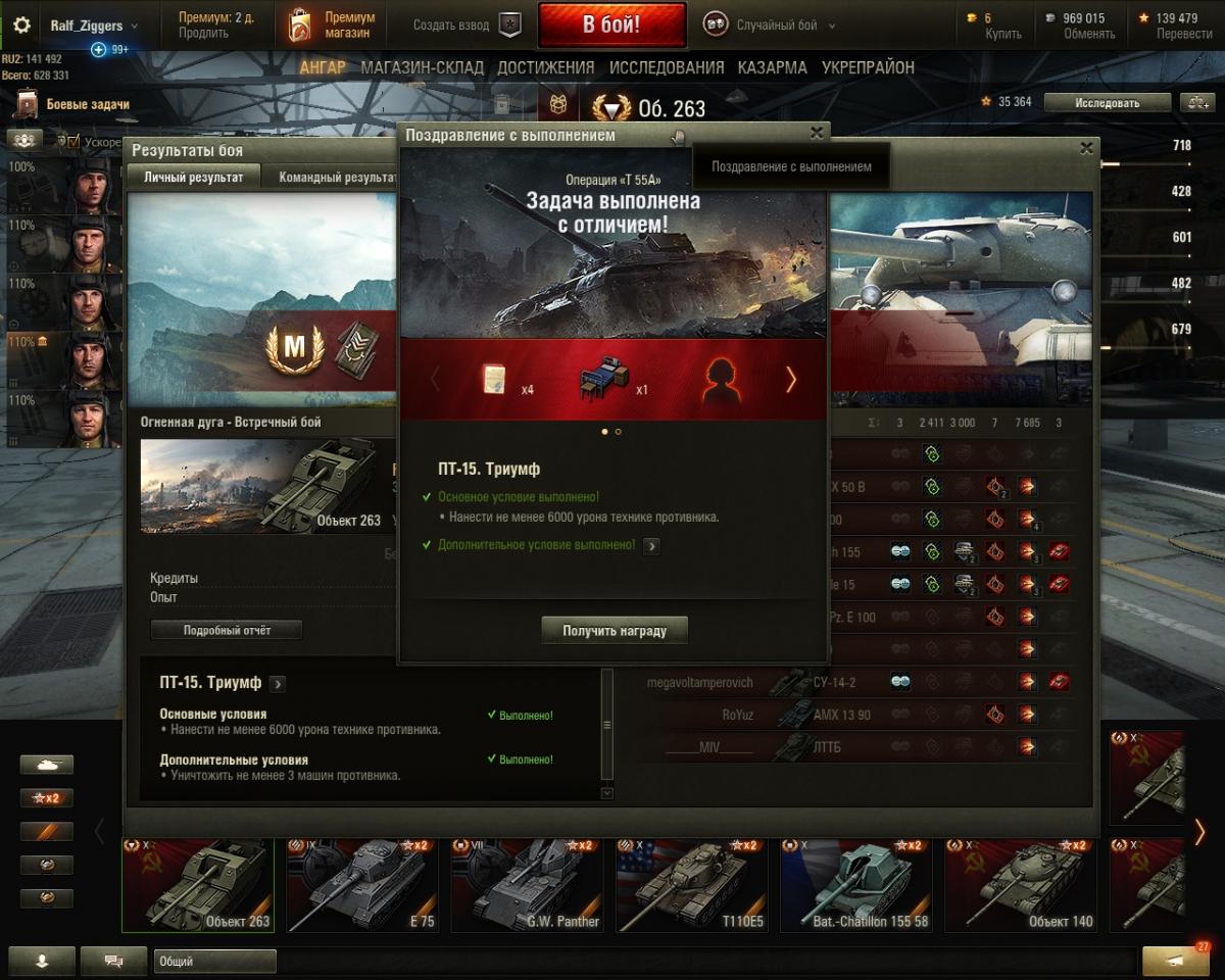 Фух...)) выполнил ПТ-15 с отличием) "Огненная дуга" ( режим "Встречный бой" ) Объект 263, наколотил 7685 урона и еле "вытащил" в конце боя 3-юю машину чтобы было "с отличием" Меня завалили по итогу, но задание уже, к тому моменту, я выполнил и бой команда выиграла. Руки потом тряслись от волнения... Пробовал проходить на Грилле 15, Т110Е3, результат 5200-5600 но всё как-то не хватало пару выстрелов до 6к дамага (3 и более машины набивал). Не хватало самого урона. Решил проходить на 263 (на нём я быстрее всего подбирался к значению 4-5 к урона за небольшое количество времени от начала боя). Не хватало то ли удачи, то ли дамаг "разворовывали", то ли и того и другого. В общем задание не из легких, но вполне выполнимое. Сочетание удачи + некоторого мастерства + более подходящей ПТ (!!) + обстоятельств на карте... Всем удачи в выполнении этой и других ЛБЗ! )