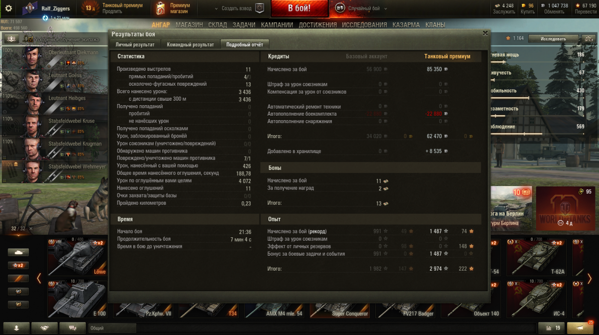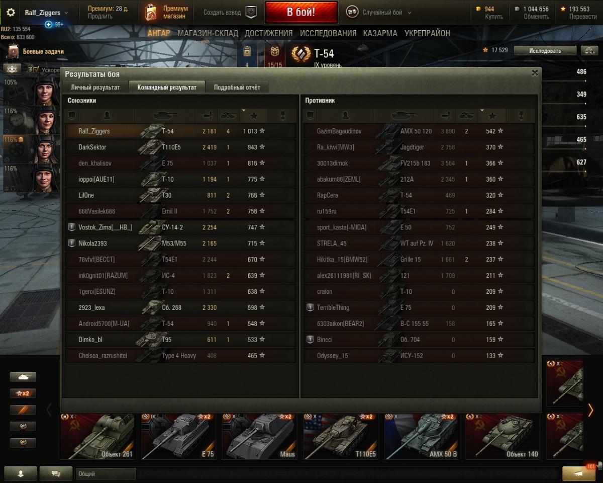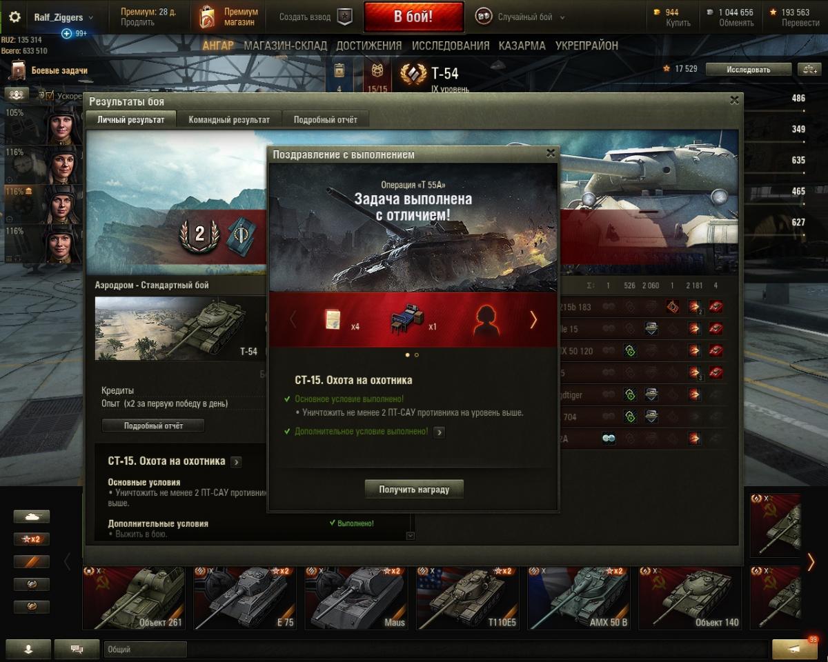 Карта "Аэродром", стандартный бой. Прошел Ст-15 с отличием, причем прошел легко, в течении недели, случайно. Вышел в бой на Т-54 просто обкатать новое допоборудование, проверить так сказать... и даже не собирался "забирать" двух ПТ-10 (Grille и FV215b (183), чуть даже не слившись в начале боя в "прениях" с Е-75, но потом зарядил куммулятивы, наши стали продавливать другой фланг, короче закрутилось и поехало, я продвигался вперед по пути забрав чисто случайно Grille 15 и в конце добрав FV215b (183), он оставался уже один из всей команды врагов, пришлось рассчитывать, в какой момент нужно сделать "решающий выстрел"... В общем просто повезло, чему я несказанно рад. Сочетание факторов таких как удача, и того, что нужно просто оказаться в нужном месте в нужное время.