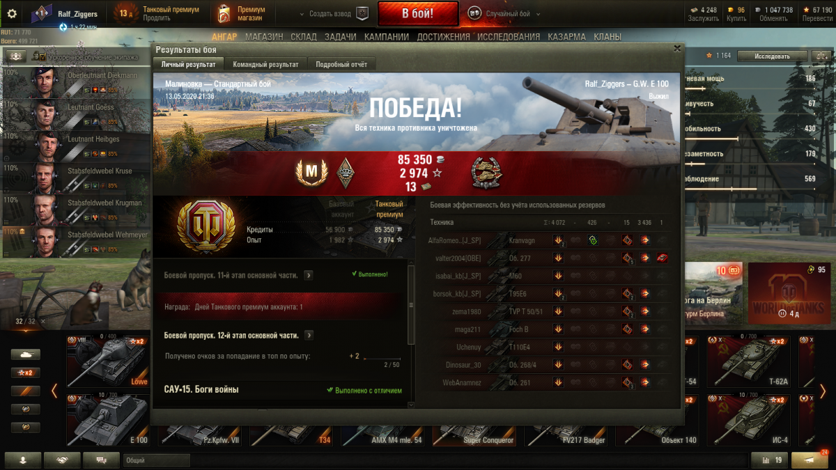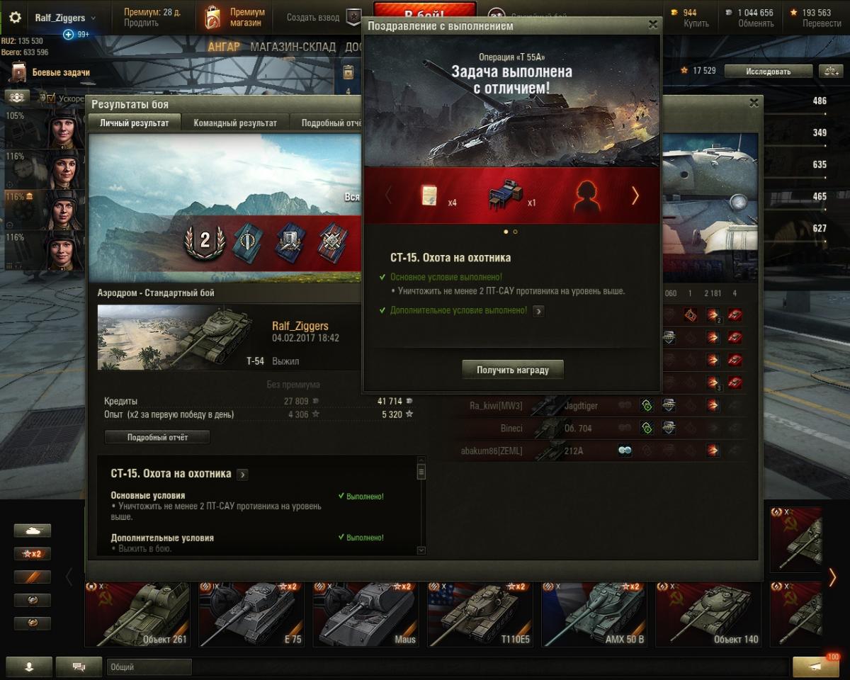 Выполнил! До этого пробовал выполнить на протяжении года (не часто, но приступал к задаче САУ-15, иногда даже по несколько дней напролет...) И выполнил, по сути, легко, за 2 дня, когда решил попробовать выполнить задание на другой арте (G.W. E 100) и стал присматриваться к результатам боя, опыту, данному в основном за дамаг ну и плюс сам дамаг... цифры были приличнее, чем на Объект-261, третье место, второе... не хватало хорошего боя и удачи. И я понял: делать эту ЛБЗ надо на G.W. E 100. Понял еще 12.05.2020, а выполнил уже 13.05.2020 вечером. Объект-261 это была большая ошибка (то дамага не хватает, как правило, то "ассиста". Хотя люди выполняли и выполняют на нем, не стану говорить что прям вообще mission impossible, но очень, очень трудно, задача сильно растягивается во времени, в потраченном времени, силах и нервах. В общем G.W. E 100 + большая карта (у меня это была "Малиновка" + активная раздача дамага и оглушение для ассиста и будем вам успех! САУ-15 "Боги войны": задача выполнена с отличием. Арта G.W. E 100, карта "Малиновка", Победа, 250 000 голды + 1 день прем + женский экипаж + бланк приказа (заложил за задачи по ЛТ, которые никогда не выполняю) и Операция "Т-55 А" выполнена! Выходим на финишную прямую к операции "Объект 260"! Всем удачи в выполнении этой ЛБЗ, вы ее обязательно выполните, раз и я смог (я уже был отчаявшимся)! "Никогда, никогда, никогда не сдавайся!" (У. Черчиль)