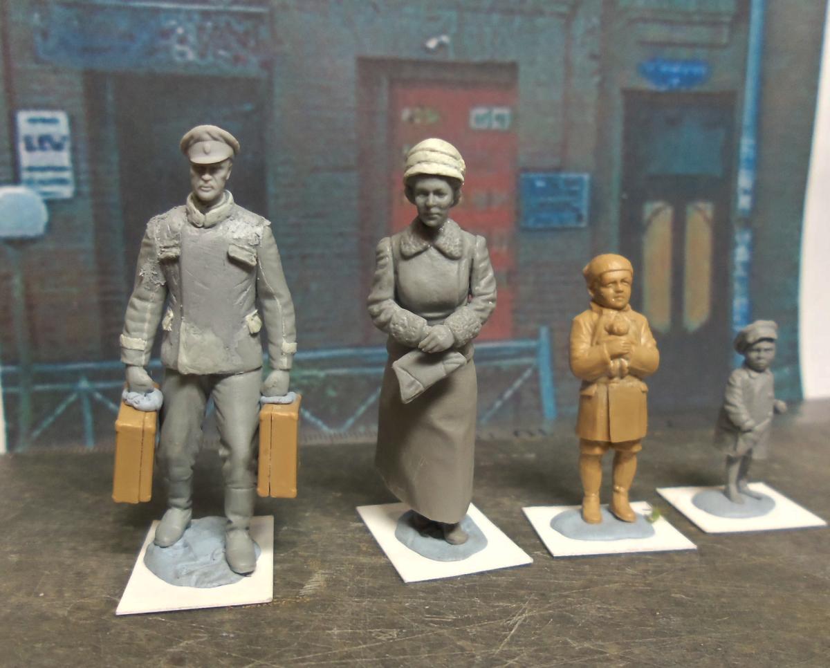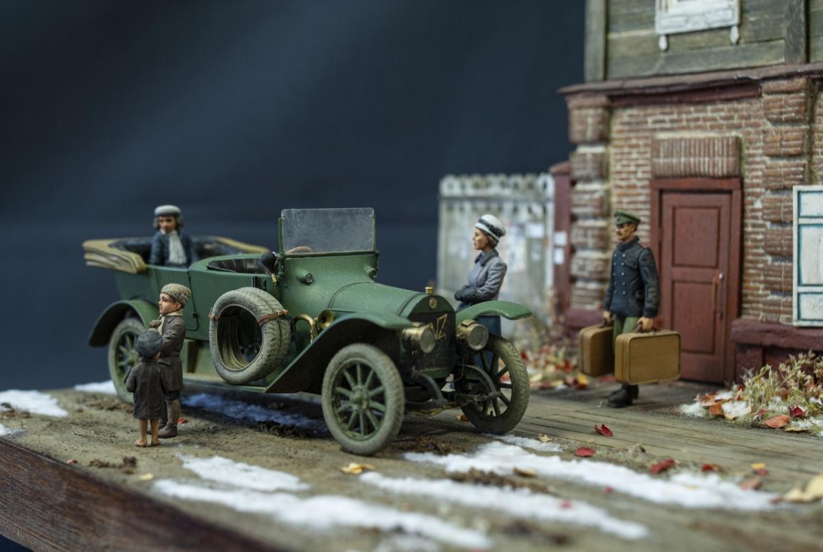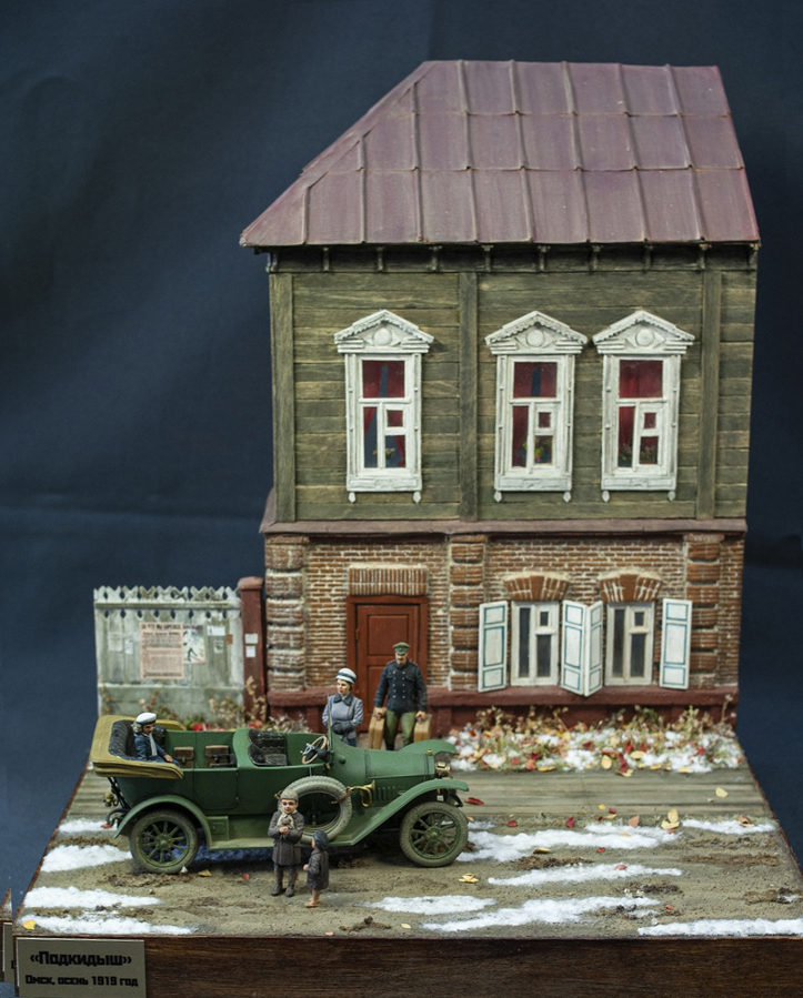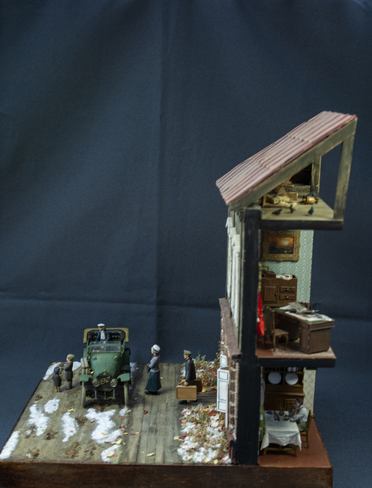 Работу над диорамой начал в июле 2023 года, дважды процесс прерывался из-за болезни. Для создания основы диорамы использовал пеноплекс, пластик ПВХ и березовый шпон. Здание сделано из пластика ПВХ с применением шпона, пеноплекса и сосновых реек и фольги. Отдельно остановлюсь на фигурах, именно с них все и началось. Точнее с босоногого нахаленка в картузе и второго цивильного с медвежонком в руках. Это два мира, это символ того раскола общества, что окончательно произошел в Российской Империи к октябрю 1917 года. Вся композиция диорамы задумана вокруг этих персонажей. Коротко о работе над другими персонажами. Девочка из МиниАртовского набора европейских беженцев 1944г. Заново сделал голову из тамиевской патти и головной убор, а так же удлинил юбку. Мама собрана из двух наборов от МиниАрта и MB. Верх от дамы из набора с пассажирами европейского трамвая, низ от дамы с велосипедом. Ее наряд делал по образу дамы с иркутской кинохроники осени 1919 года, от туда же взял и головной убор мальчика. Шофер из МиниАртовского набора немецких артиллеристов. Из тамиевской патти сделал коррекцию куртки, голову взял из набора от Армы, чемоданы от Бронко, пуговицы сделал из декали клепок от Квинта. Погоны сделаны декалью по моему заказу. Красил стены акрилом от Звезды и краской Моделист. Остальные фигуры окрашены красками Vallejo. Эффекты наносил красками Звезда и смывками от MIG и маслом. Большая часть мелочевки самодельные. Газеты, пластинки, фотоальбом и картины уменьшены в фотошопе и распечатаны на цветном принтере. Мебель очень старый набор от Верлиндена, граммофон 3д печать от ДМС. Чернильница на столе сделана из литника. Добавил: снег, имитация навоза на дороге, птичек(3д печать),