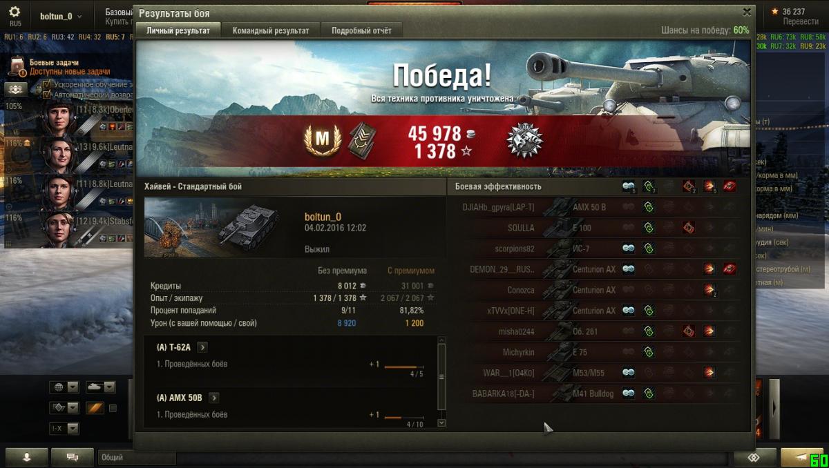 Тоже сделал пару дней назад на т62а. Кому интересно, смотрите. http://wotreplays.ru/site/7574353#stats