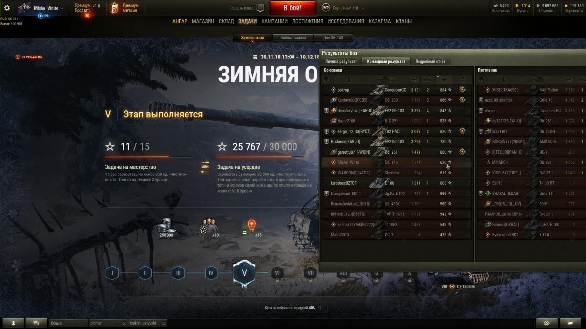 С 5ым выполнением ежедневной задачи опыт в Зимней охоте обновился. Сразу прибавилось 2 тысячи. Действительно, не во всех боях попал в топ 10. Спасибо, тема закрыта. Но какой-то глюк есть. Вот, собственно, если не верите. 1 скриншот. Это я перезапустил игру. Об.140 в бою. http://cdn-frm-eu.wargaming.net/wot/ru/uploads/monthly_12_2018/post-1917924-0-16041200-1544114254_thumb.jpg Дальше, Об.140 вышел из боя. http://cdn-frm-eu.wargaming.net/wot/ru/uploads/monthly_12_2018/post-1917924-0-18313600-1544114185_thumb.jpg Собственно, результат боя. http://cdn-frm-eu.wargaming.net/wot/ru/uploads/monthly_12_2018/post-1917924-0-78198100-1544114160_thumb.jpg