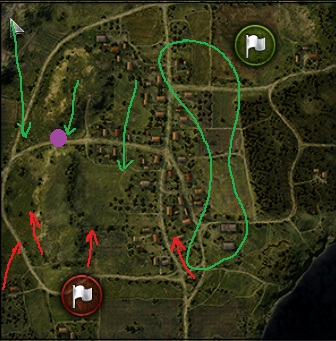 Дело в том, что разрекламированные прорывы через лес с нижнего респа - это достаточно редкое явление, требующее неплохой координации команды, в то время, как А1 - это перманентно дающая преимущество точка, в результате чего нижний респ вынужден играть от дефа базы. Те же, кто по привычке едет по 1-2 линиям, попадают под перекрестный огонь: средние с А1, ПТ из леса, плюс с холма в обозначенную на картинке кружком точке могут скатиться тяжи/ст, попадая в мертвую зону для арты, они защищены холмом. А были времена, когда на том углу были веселые перестрлки тяжей, которым ассистили с холмов стшки... В результате имеем два классических сценария: либо народ по привычке едет по 1-2 и отдается там, либо вся команда *** на холме перед лесом, в то время как верхние спокойно доезжают до базы, выковыривая там пару ПТ и арту, после чего берут лесных в клещи. Я бы предложил вкорячить симметричный холм. В результате весь центр станет защищенным от лесных ПТ и предоставит возможность рубилова в городской черте, которая сейчас вообще не используется. Плюс карта станет классической в плане "три маршрута атаки".