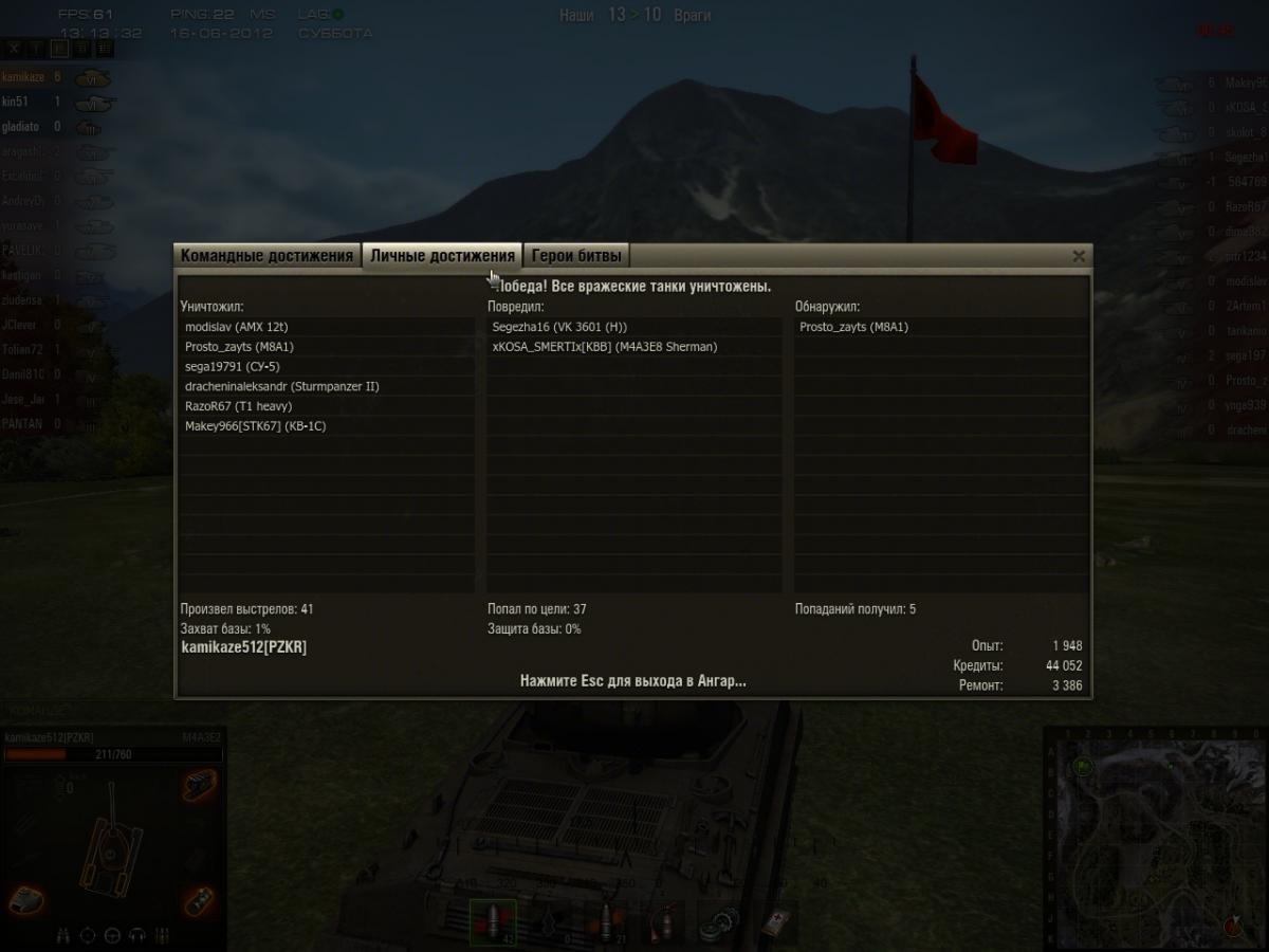 Отыграл очень даже неплохой бой на джамбо, надрочил набил 6 фрагов, так же как и вражеский кв-1с, сказано, что в таком случае "звание присваивается игроку, получившему за бой большее количество очков опыта с учетом наличия/отсутствия премиум-аккаунта" . Я получил 1948 опыта( естественно с учетом премиума ), но воина получил "квас". Конечно странно, что он проиграл, и получил больше, решил зайти посмотреть статистику этого игрока, и увидел что максимальный опыт у него на кв-1с всего 840, даже если учитывать двойной опыт, у него всеравно меньше было бы. Так вот объясните, пожалуйста, мне пожалуйста причину, по которой я остался без медали. Тащемта, вот сам реплей http://wotreplays.ru...kamikaze-m4a3e2