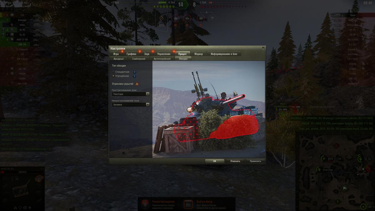 1. Когда в определенной зоне рядом с танком, на который наведён прицел, находится другой танк, вокруг последнего тоже отрисовывается частичная обводка. Судя по всему, нежелательная обводка прорисовывается в определенном радиусе от центра выделенного танка. Проблема проявляется как в бою, так и после уничтожения танка, на союзных и вражеских танках. Также обводка появляется на союзниках рядом с прицелом (когда центр прицела наведён не на какого-либо игрока). И здесь же (на скринах и реплее) видно как обводка вражеских танков стала зеленой. Все описанные проблемы актуальны для настроек на скринах. И все проблемы разом решает переключение прямо во время боя типа обводки с "упрощенной" на "стандартную". Если при "упрощенной" обводке изменить отрисовку укрытий - враги становятся красными, но ненадолго. На некоторых танках противника заметил что при наведении прицела на гусеницу обводка красная, а при наведении на броню - снова зелёная.