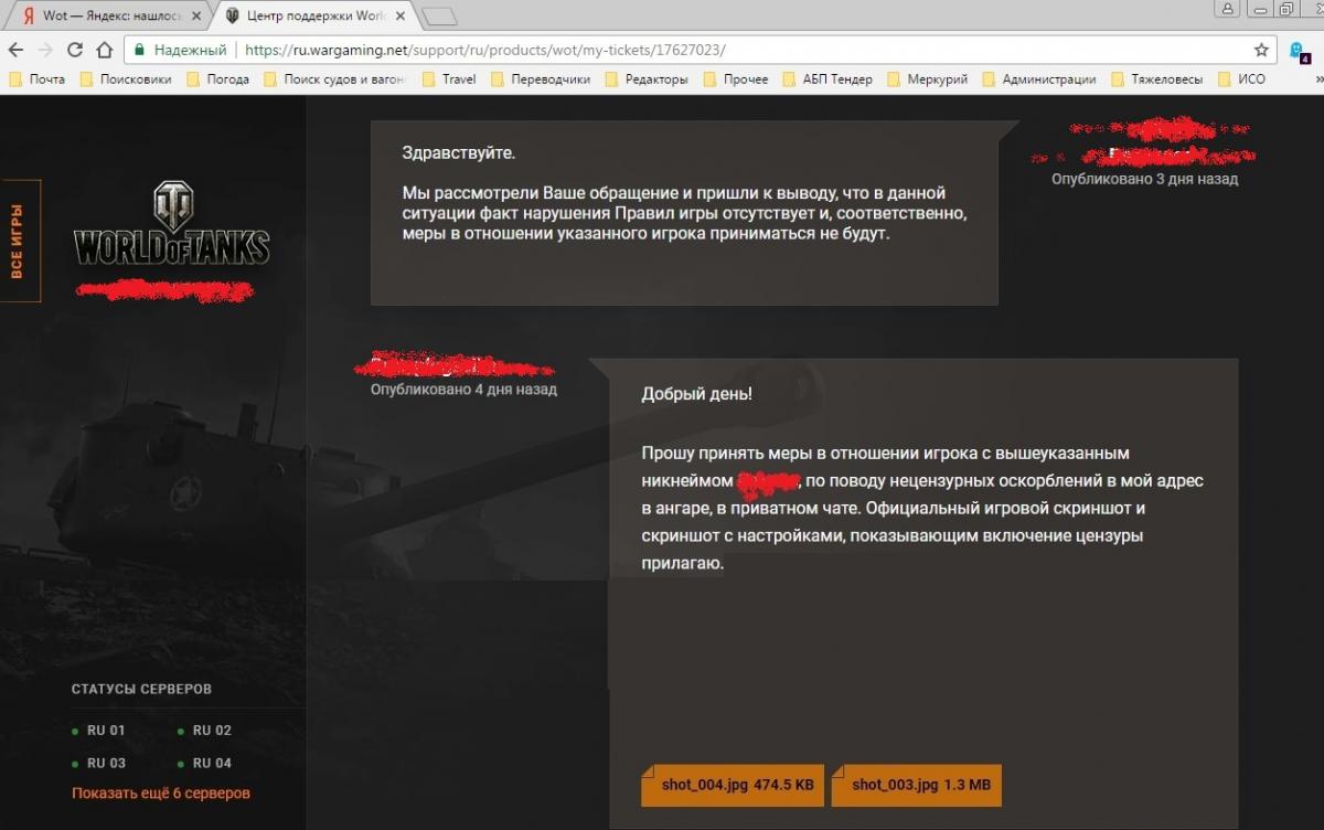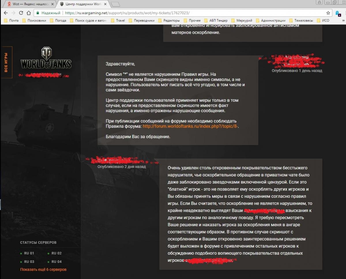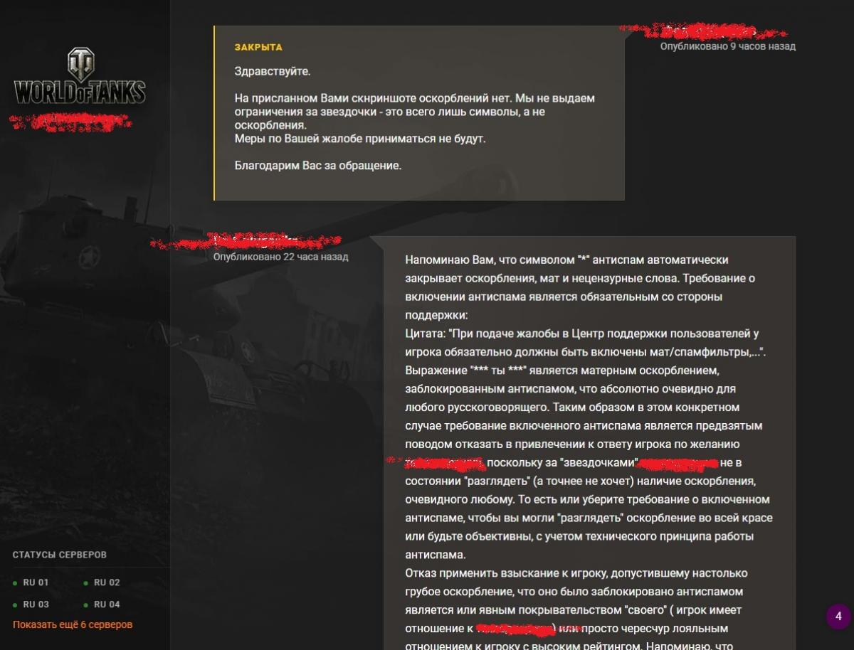 Теперь понятно количество нарушителей правил не уменьшается - темы про них просто "исчезают". меры не принимаются. Очереднаяя Тема исчезла, видно кому-то общее обсуждение подобного не по душе. Ну что ж - напишем еще раз с максимальным следованиям правилам участия в форуме. Вопрос на основании чего и по какому праву будет удален этот вариант - полностью соответствующий правилам форума? В предыдущих вариантах на скриншотах была видна "личная" информация – согласен - нарушение – исправлено! Добрый день всем! Предлагаю на обсуждение ситуацию, которая показывает, что наша развлекаловка по прежнему остается самой "лояльной" игрой по отношению к хамам, нарушителям правил и прочим ….. Перейдя как-то в ангар, увидел сообщение от очередного "нехорошего человека", решившего вылезти из своей норы и сунуть нос в мой светлый офис (скриншот прилагается) с оскорблением в мой адрес. Разумеется, как представитель разумного человечества, а не дикое прямоходящее, решил решить вопрос по правилам игры - написал кому надо. Как требуют правила обращения, использовал включенный мат/спам фильтр с приложением скриншота, который заменил матерные оскорбления на символы "*". Ответы и реакцию кого надо (а точнее ее отсутствие) можете посмотреть на приложенных скриншотах. Я в шоке, но по логике тех, кто должен бороться с нарушителями: 1) выражение " *** ты *** " оскорблением не является, так как звездочки не являются оскорблением. Одними из аргументов является то, что те, кто должен НЕ ВИДИТ оскорбления в " *** ты *** ", очевидного любому русскоговорящему и настолько грубого, что фильтр оставил "незапиканным" только ТЫ; 2) игрок просто от нечего делать накидал мне звездочек, а это не является нарушением правил. ПРОСТО ЗВЕЗДОЧКИ. Высокоинтеллектуальный факт полнейшей бессмыслицы одновременного требования включения фильтра и предоставления «доказательства» оскорбления, которое фильтр автоматически заменяет на звёздочки, те, кто должен осознать, видимо не в состоянии. Продолжая следовать логике тех самых, любое выражение типа «Я *** маму ***, *** ты ***, *** ***, и тебя тоже ***, *** ***» оскорблением не является. Конечно с опытом жизни на пятом десятке я могу заткнуть по оскорблениям кого угодно, но мне просто противно связываться со всяким малолетним сбродом. Но и оставлять хамство безнаказанным тоже не позволительно. Что предложите, господа/товарищи? Оскорблять в ответ, пользуясь предоставленной "ими" «инструкцией»? Или может кто-нибудь предложит более цивилизованный и интеллектуальный способ наказания нарушителей, раз ОНИ в таких ситуациях беспомощны? К сожалению, просто заносить их в черный список после получения сообщения с оскорблением не вариант. Отключить полностью получение сообщений тоже - почему нормальные люди должны ограничивать себя в чем-то из-за нарушителей? За оскорбление правилами игры предусмотрено наказание? – должно применяться. Шроту предлагаю не пыхтеть по тупому. По роду работы у меня под ногами и в реале его беспомощно пыхтит не одна тысяча - привыкший - так что жду конструктивных предложений от вменяемых игроков. http://cdn-frm-eu.wargaming.net/wot/ru/uploads/monthly_07_2018/post-1970191-0-28577000-1532082570_thumb.jpghttp://cdn-frm-eu.wargaming.net/wot/ru/uploads/monthly_07_2018/post-1970191-0-31101100-1532082577_thumb.jpghttp://cdn-frm-eu.wargaming.net/wot/ru/uploads/monthly_07_2018/post-1970191-0-25414500-1532082591_thumb.jpghttp://cdn-frm-eu.wargaming.net/wot/ru/uploads/monthly_07_2018/post-1970191-0-58002400-1532082602_thumb.jpg