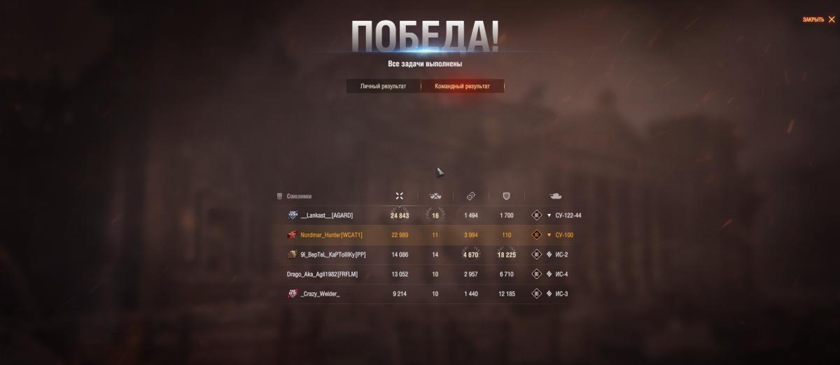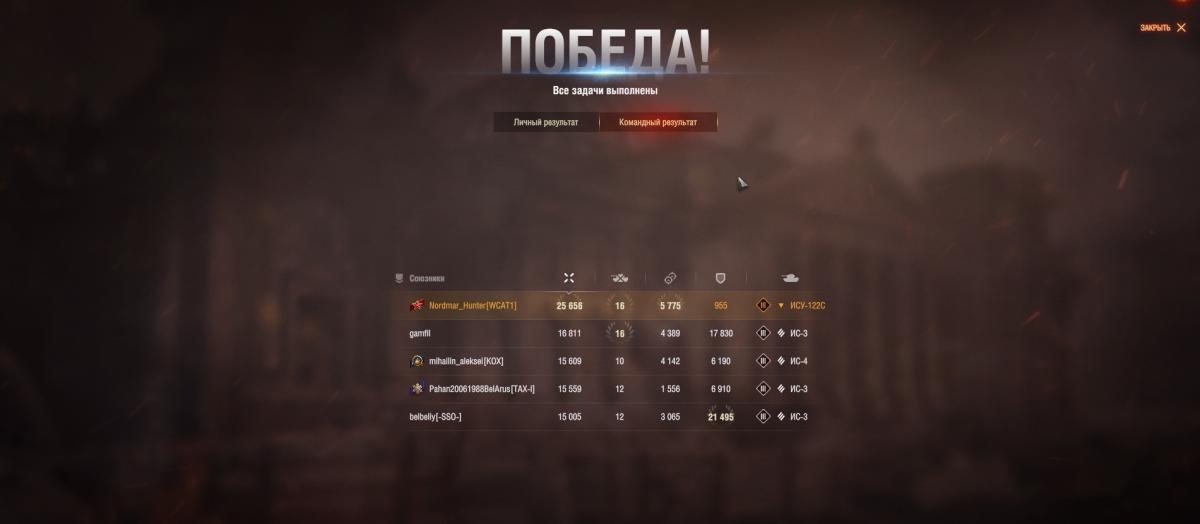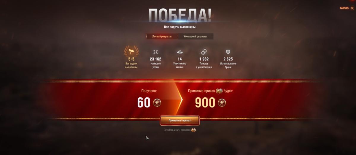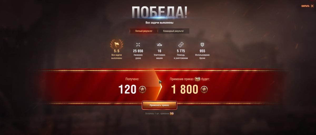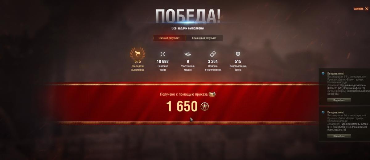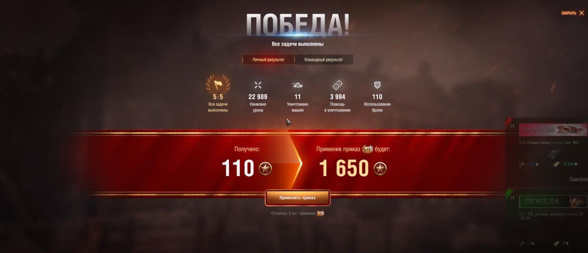 Да, спасибо. Только что из Берлина (я на него, хвала Белиару, часто попадаю). Победа, первое место, 120 очков. Вообще, это, конечно, бр.... не очень хорошая идея. Во-первых, в принципе почему награда игрока зависит от удачи? Выпал Берлин, не выпал.... Т.е. кто-то по сути в два раза будет медленнее проходить Прорыв, потому что ему Берлин не падает Хотя играет человек хорошо... Ну и, во-вторых, "прозрачность" начисления очков отсутствует как класс. Когда уже какое-то число боёв отыграл, там всё понятно становится, но поначалу... А ведь можно использовать только максимальный бонус к опыту... И поначалу его можно слить на не самый удачный бой... Хотя в целом режим на твёрдую четвёрку. Как я уже сказал, есть дисбаланс техники (особенно в Обороне на 1 уровне: КВ-1 тупо хуже по всем характеристикам орудия, чем БТ-7арт), дисбаланс карт... Но атмосферно, неплохие награды, ощущается личный вклад в результат боя. В общем, хорошо. К слову. Если в Обороне я регулярно покупал х10 за серу (не понимаю тех, кто покупал "про запас", я только непосредственно перед боем покупал), то в Прорыве я попробовал ТТ1 уровня, не понравилось. Кинул 1000 голды в любимые ПТ и вообще проблем не видел. х15 за выполнения прогрессии, плюс откуда-то ещё х10 остались. Я сейчас закрыл 8 этап, дали ещё три х15. Мне осталось 2,5К очков и у меня в запасе по три штуки х15 и х10. Т.е. закрыть можно больше ничего не покупая. Но повторю: мне часто падает Берлин, а это очень много очков! А если кто ещё не начал проходить Оборону, то рекомендую ПТ проходить "ручками", без покупки 3го уровня. БТ-7арт на 1 уровне рвёт всё и всех и соревнуется только между собой, но на 2 и 3 уровне его нет. Только редкие СТ, хорошо кидающие мины, могут составить артоБТ конкуренцию. ТТ в Обороне вообще не понял, но я там только на первом уровне играл. Скучно, неэффективно. Короче, сначала БТ-7арт, потом массовые мины от СТ и Оборона пройдена. Всем доброй охоты, добивайте фрицев.