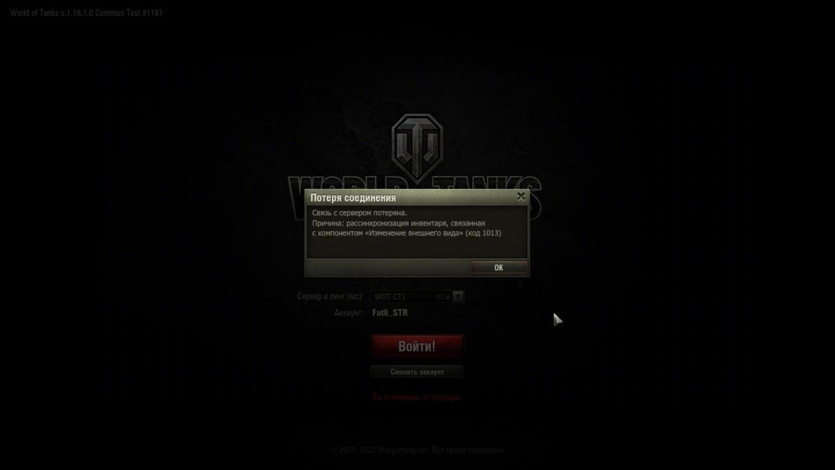 Зашёл на аккаунт, захожу через WGцентр в клиент игры, захожу на какой-либо сервер (пробовал на оба), дожидаюсь очереди, крутится шестерёнка с эмблемой WoT с текстом в последовательном порядке: "Подключение"=>"Синхронизация оборудования и снаряжения"=>"Связь с севером потеряна...".