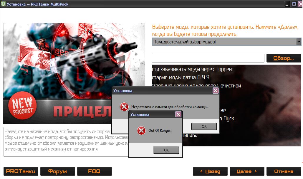 Вот такая вот петрушка Вер.3 После нажатия на ОК на этих кнопочках вылезают не менее забавные окошки с ошибками. Убивается только через диспетчер задач (ну можете еще после 50-100 окошек таких, ждать не стал. на 10 окне надоело) сразу для любителей покричать про конфигурацию компа: танки идут, ранее этими модами пользовался ну итд