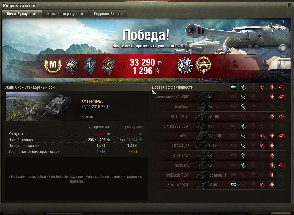 Ну *** хоть кто-то плюсик в карму сковороде написал))))Пересмотрел репку-если мадам может выдать овер 3к дамага-пацаны стыдитесь.Не все однозначно в бою-но могу сказаь ,что тот чел кто ее учил знал дело в пт.Гляньте как она экономно преезжает бархан в начале боя.И как потом пытается менять позиции. Катэ -одобрямс