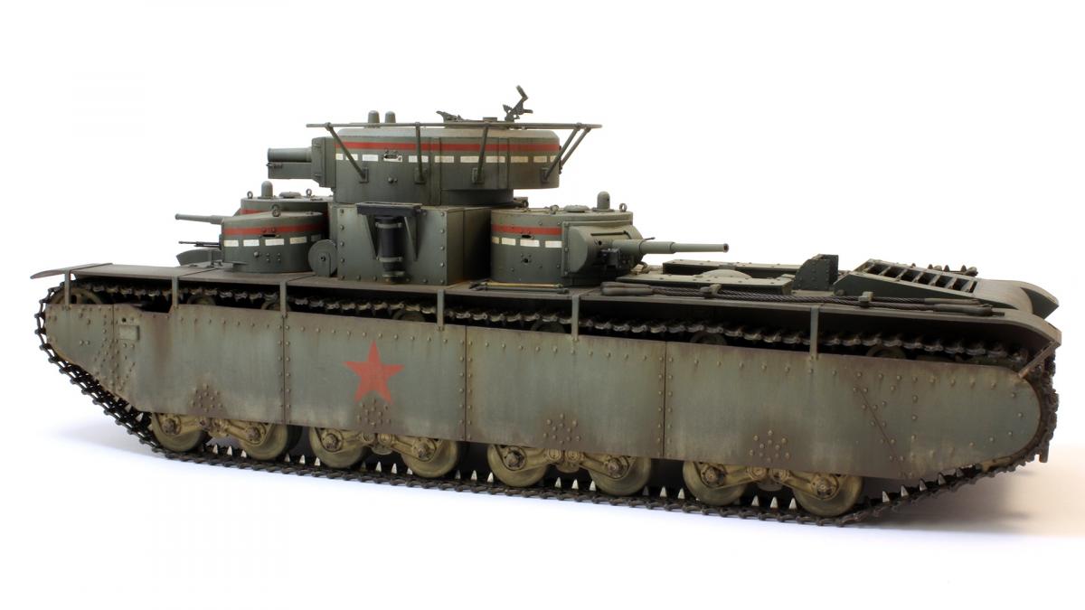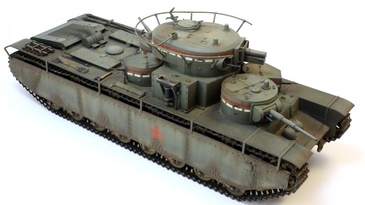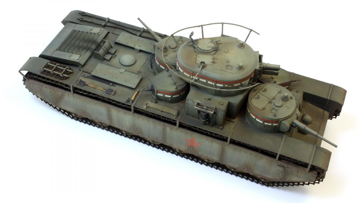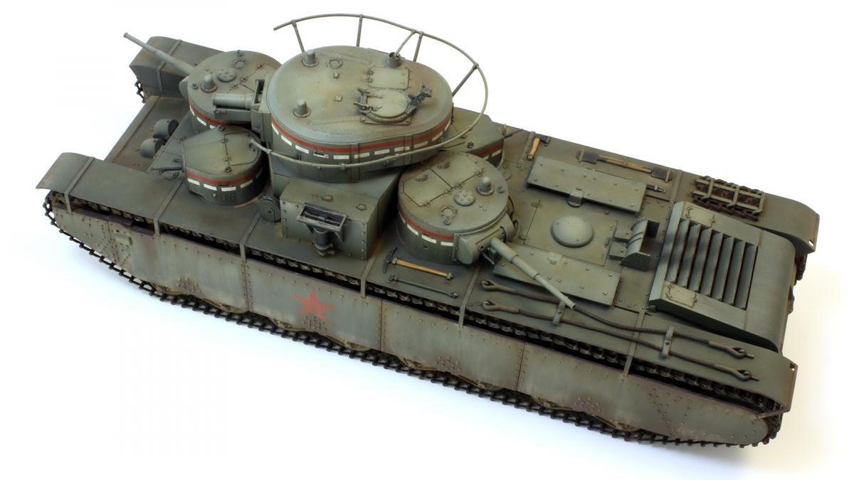Т-35 от Звезды. Надеюсь, туда выложил, или если танка нет в игре надо было в "проекты не связанные с wot"? Доработки: Просверлена поручневая антенна, оптические приборы; Траки MasterClub MTL-35035; Стволы 45-мм орудий ABR35-L112; Тросы Eureka Использованные материалы: Базовый цвет корпуса: AK Interactive RC077 ZB AU Basic Protector (Зэ Бэ, Карл!!!); Для высветлений: Tamiya XF-2 Flat White + Tamiya XF-3 Flat Yellow; Фильтры: AmmoMig 1508 Green For Grey Green; AmmoMig 1511 Brown For Dark Yellow. Для декалей Setter и Softer от Mr Color Масляные точки: ABT-320 Vehicle Weathering and Effects; ABT-300 German Armour Tones. Сколы: AMMO MIG Chipping + Простой карандаш. Потеки: Масло 502Abt ABT-130 Dark Mud и ABT-080 Wash Brown. Смывка: Tamiya 87140 Panel Line Accent Color (Dark Brown). Траки: XF-1 Flat Black + X10 Gun Metal + XF52 Flat Earth; Грязь и пыль на корпусе и траках: AK 017 Earth Effects AK 023 Dark Mud AK 8027 Dry Mud AK-4063 BROWN EARTH DEPOSIT Мелочевка: Катки: AK720 Rubber Tires Пулеметы: Citadel Chaos Black + Citadel Boltgun Metal; Внешняя часть ленивце в и ведущей звездочки: Citadel Boltgun Metal; Тросы: Citadel Chaos Black + Citadel Boltgun Metal + ZIPМакет Ржавчина коричневая + MIG P024 Light Rust; Запасные траки: чернение AK-159 Metal Burnishing fluid Деревянные элементы: Vallejo 71027 Light Brown + масло Потеки ГСМ: MIG Grease Stain Mixture + MIG Dark Wash Лаки: Tamiya X-22 Clear и Mr. Color C182 Flat Clear.