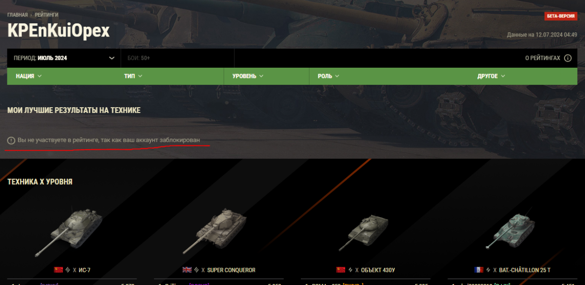 https://forum-mt-prod.lesta.ru/monthly_07_2024/post-20702265-0-06097600-1720763059_thumb.png Пишет что заблокирован. Но на самом деле заблокирован аккаунт wot/eu, wot/ruby (МирТанков) работает.Ещё раз поясню, если это чем-то поможет - аккаунт WG был переведен на евросервер, затем отдельными заявками в саппорт в течение месяца wot и wows были возвращены на RUBY кластер. Wowp остался на EU.Вроде бы технически это реализовывалось блокировкой аккаунта в конкретной игре там (eu) и разблокировкой тут (ruby).