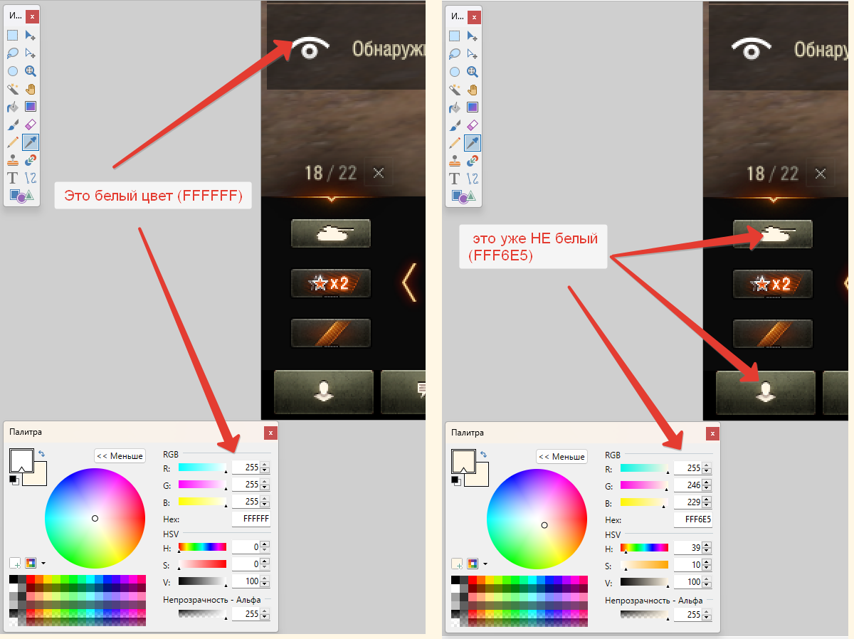 вы правда скрины смотрели? RGB код цвета говорит иначе чем вы видите. белый цвет это FFFFFF а у нас FFF6E5 - это как раз оттенок розового. Не верите сделайте сами скриншот и в любом редакторе проверьте элементы игры и текст - инструмент как правило называется Color Picker.(Пипетка).что не оставит никому места для субъективного мнения.