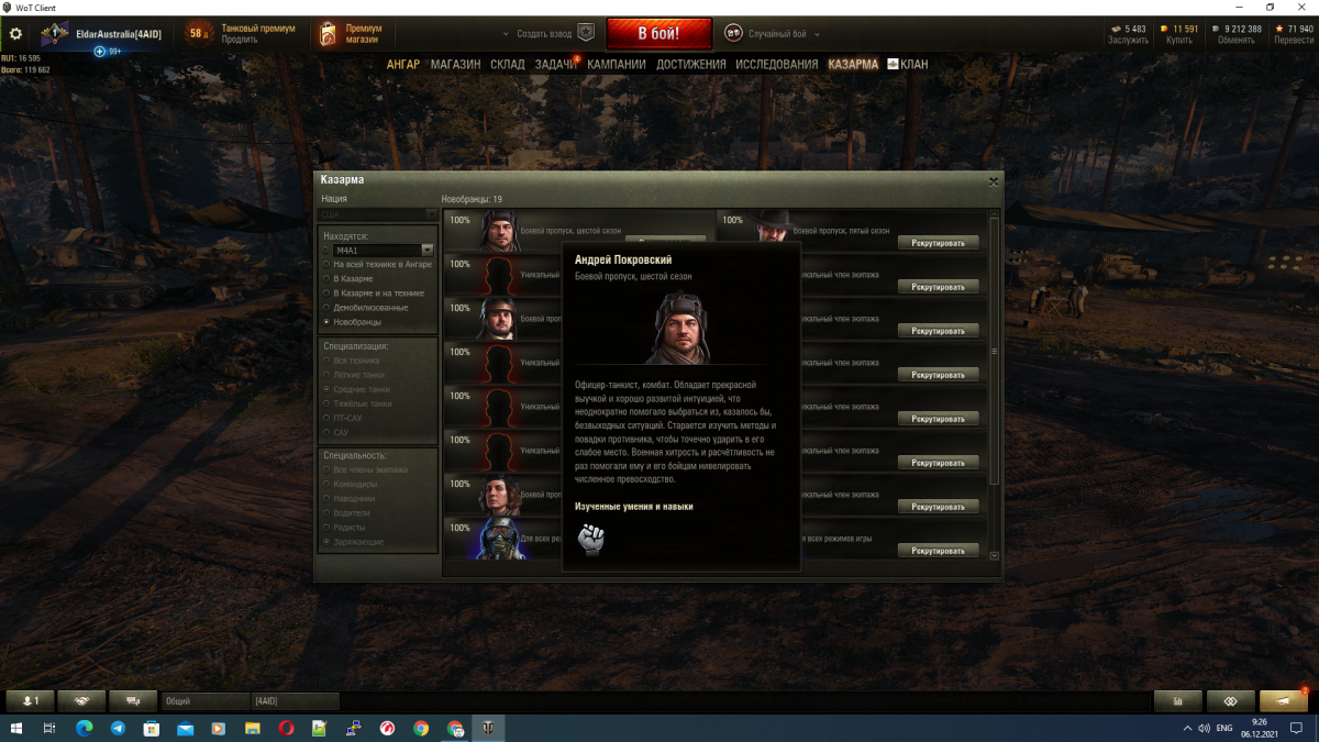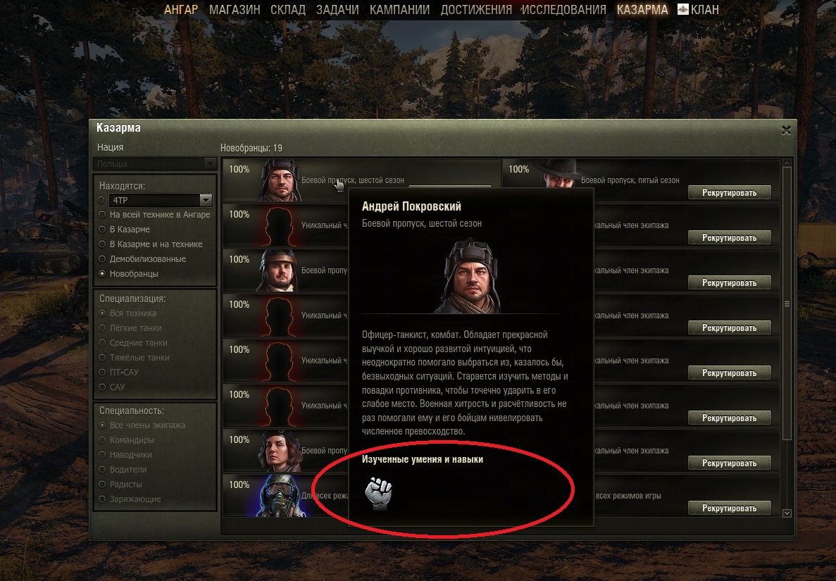 В казарме есть несколько новобранцев, Как узнать сколько у них перков? То есть, только "боевое братство" (нулевым естессно) и остальное надо вкачивать, или "боевое братство" и ещё два перка есть. В Казарме не отображается эта ***. Я к тому, что хотел собрать одын экипаж сразу вкачанный, что б учебник не тратить на 250К опыта. Но застрял на этом месте. Вот как пример два файла, на одном изображении (в казарме) отображается только "боевое братство", хотя мы знаем (на втором изображении) что суслик есть, но его не видно.