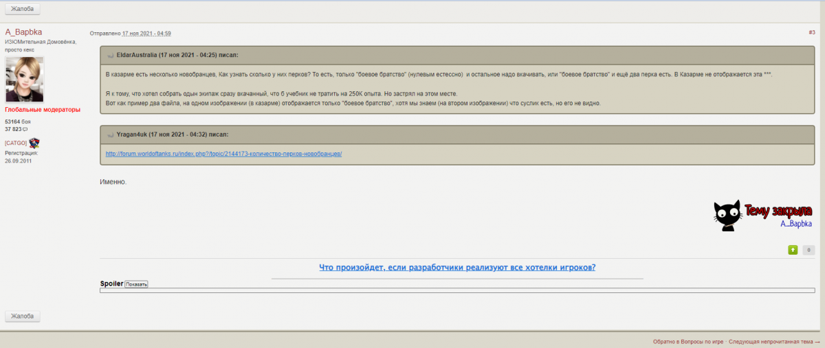 Не все понимают о чём речь. Действительно, если появляться новые перки и они важные для тебя, то тебя вынуждают платить золотом за сброс. Или, пыхтеть в прокачке перка, а седьмой перк требует суммарно 13 443 840 опыта. Как бы да, хочется до пенсии вкачать седьмой перк Автора поддерживаю. Но мне кажется не стоит надеяться, у меня сильные сомнения что жадность сможет проиграть тому доброму и светлому затронутому (обозначенному) в фильме про WOT,