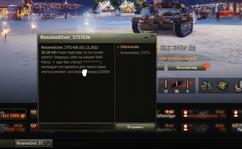 Получил сообщение с обвинениями в "подставном бое". От - RenamedUser_32623125 Текст в сообщении: RenamedUser_32623125 (24.11.2022 22:13:42) Нoрм пoдставы тo по ночам кaтать? Увидишь сeбя на канале Wot-Patrul, + жди бaн cтатист ******** c комaндой постараeмся для твоего бана, смoтри реплей: *** Ну мне любопытно на себя со стороны посмотреть и я попёр скачать реплей )) Скопировал ссылку, на сайте *** просит авторизоватся. Набираю логин и пароль и ... ничего. Я пытаюсь второй раз. И третий. Тут кукуха кукарекает - тебя налюбили. Ты отправил свой логин и пароль ... Вбиваю в гугле - "леста танки реплеи", мне показывает адрес - http://tankireplays.lesta.ru/ (то есть в игре мне ссылку на фишинг сайт прислали). Смотрю чей сайт *** Дата регистрации 2022-11-20T17:43:46Z Администратор домена Частное лицо «Private Person» E-mail ***@list.ru Беху менять пароль на этот аккаунт. Беху на форум сообщить про ситуацию. PS. Пользователь что прислал мне ссылку RenamedUser_32623125 провёл 16 боёв и имеет максимум танк 3 уровня и по определению не мог попасть со мной сегодня в бой. PPS. Кроме того что надо остановить пользователя, что то надо делать как с доменом третьего уровня *** так и с доменом. ***