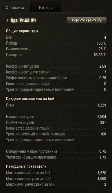 4 боя. Мне, как слабому игроку, танк показался приятный по игре. можно и из кустов, а также и на первой линии против тяжей( приходится ждать их ошибки чтобы полюбить на 400 дамага) не всем зайдет(не прощает ошибок)
