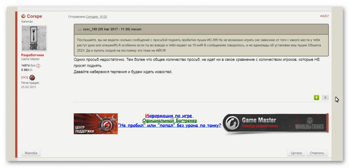 Ахаха тут вспоминаешь, январь (вроде тогда был стрим разработчиков с трамваем921 и вспышкой), где они сказали, что в планах апнуть советов. И тут в долгожданном апе ты видишь... ЭТО... Ребланас. Ладно ок, забирайте пробой в 288 давайте в 260, но дайте точность/стаб/сведение. А не 190 хп, это просто смех на палочке, примерно такой же как +250 хп ис7.... Ладно хоть +190 хп прочности, а то они могли эти 190 хп трипилексам отдать...