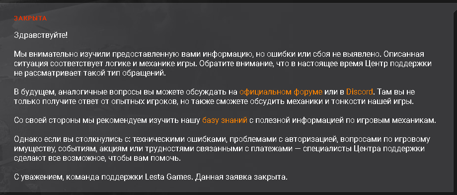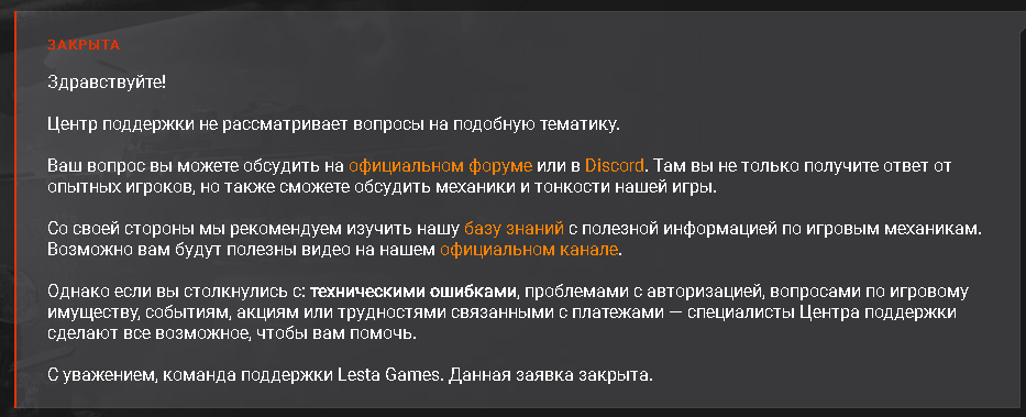 доброго всем !!! проблемы следующие : 1) заблокированная карта а именно ЭНСК периодически выпадает и приходится пострадывать !!! 2) срабатывание "лампы" (6-е чувство) происходит даже в тех случаях когда в радиусе 700 метров нет противника - стоя на арте на респе союзном наблюдаю сверху за 2-я оставшимися противниками на вражеском респе окруженных 5-ю союзниками на расстоянии 700+ метров между нами горы реки и леса и .............. ЛАМПА !!!!!!!! соответствующие скрины и реплеи приложил к писмеенному обращению в ЦПП и получил ответ на оба обращения ! получается что системные ошибки они же баги теперь просто надо обсуждать на форуме ???!!!))) - что дальше ??? Здравствуйте! Центр поддержки не рассматривает вопросы на подобную тематику. Ваш вопрос вы можете. Там вы не только получите ответ от опытных игроков, но также сможете обсудить механики и тонкости нашей игры. С полезной информацией по игровым механикам. В Однако если вы столкнулись с: техническими ошибками, проблемами с авторизацией, вопросами по игровому имуществу, событиям, акциям или трудностями связанными с платежами — специалисты Центра поддержки сделают все возможное, чтобы вам помочь. С уважением, команда поддержки Lesta Games. Данная заявка закрыта.