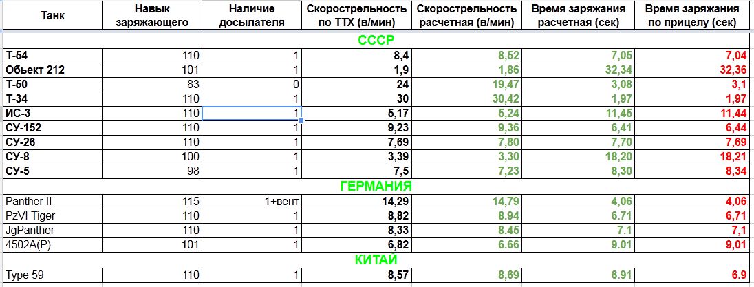 Пока не считал - некогда, но замеры танков провел. CCCР Т-54+досыл: экипаж 100+10% - 7,04 сек (8,4 в/мин по ТТХ) Объект 212+досыл: экипаж 92+9% - 32,36 сек (1,9 в/мин по ТТХ) Т-50: экипаж 75+8% - 3,1 сек (24 в/мин по ТТХ) Т-34+досыл: экипаж 100+10% - 1,97 сек (30 в/мин по ТТХ) ИС-3+досыл: экипаж 100+10% - 11,44 сек (5,17 в/мин по ТТХ) СУ-152+досыл: экипаж 100+10% - 6,44 сек (9,23 в/мин по ТТХ) СУ-26+досыл: экипаж 100+10% - 7,69 сек (7,69 в/мин по ТТХ) СУ-8+досыл: экипаж 92+8% - 18,21 сек (3,39 в/мин по ТТХ) СУ-5+досыл: экипаж 88,5+9% - 8,34 сек (7,5 в/мин по ТТХ) Немцы Panther II+досыл+вент: экипаж 115% - 4,06 сек (14,29 в/мин по ТТХ) PzVI Tiger+досыл: экипаж 110% - 6.71 сек (8.82 в/мин по ТТХ) JgPanther+досыл: экипаж 110% - 7.1 сек (8.33 в/мин по ТТХ) 4502A(P)+досыл: экипаж 101% - 9.01 сек (6.82 в/мин по ТТХ) Китаец Type 59+досыл: экипаж 109% - 6.96 сек (8.57 в/мин по ТТХ)