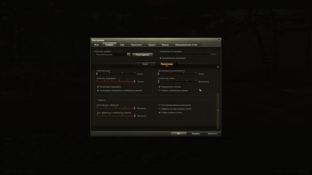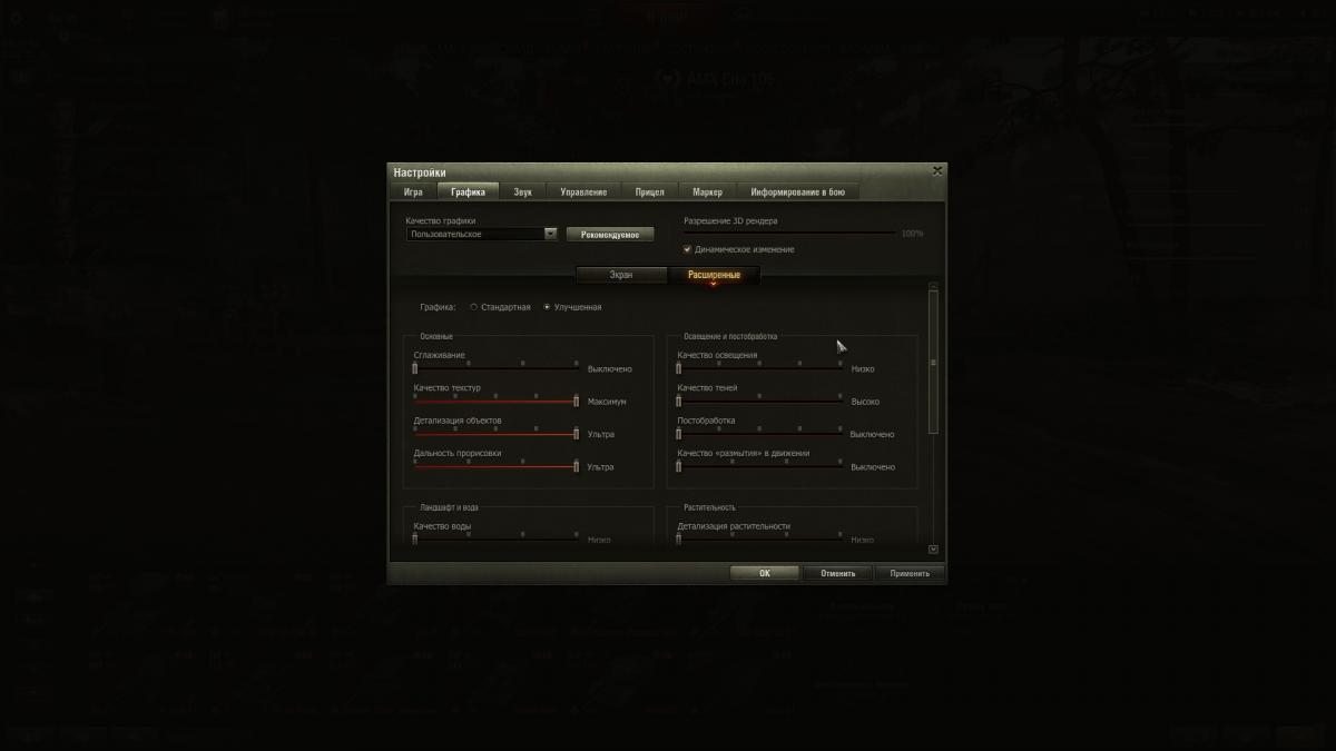 Всем привет. Что еще надо докрутить подкрутить чтоб ландшафт отрисовывался полностью ? На скрине танк виден http://cdn-frm-eu.wargaming.net/wot/ru/uploads/monthly_02_2019/post-2138257-0-29024700-1551353389_thumb.jpg, а по факту там еще холм Который ближний ко мне слева, и стреляешь в землю. Настройки видео (HD клиент) на скринах.http://cdn-frm-eu.wargaming.net/wot/ru/uploads/monthly_02_2019/post-2138257-0-05584100-1551353394_thumb.jpghttp://cdn-frm-eu.wargaming.net/wot/ru/uploads/monthly_02_2019/post-2138257-0-46907300-1551353398_thumb.jpg Моды от про-танки стоят. Без модов так же бывает.