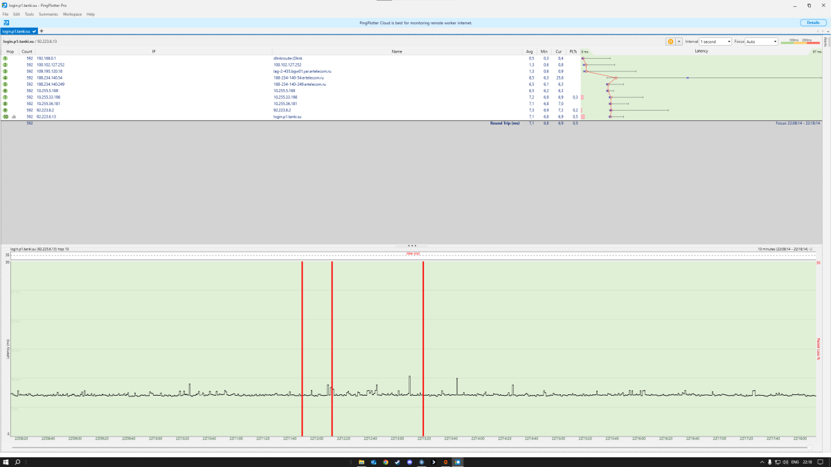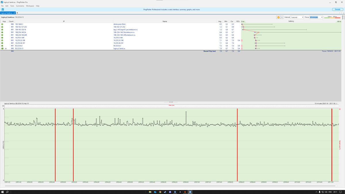 Волшебная программа на этот раз запустилась, после 10 переустановки, сриншота нет. Что вообще она может показать за 15 минут проверки 3 серверов непонятно, еще в эти 15 минут входит проверка клиента. Тот же PingPlotter дает намного больше информации. Разгона процессора у меня нет. Разгон оперативной памяти убирать нет смысла. Летом когда Леста чинила игру 3 месяца для карт AMD, была сделана полная диагностика ПК, в том числе 2 теста оперативнной памяти (memtest5 anta777 и memtest86), никаких проблем небыло. И вообще как потери пакетов и лаги, когда загорается красная лампа в игре, связаны с разгоном??? Мне может еще БП заменить и файл подкачки увеличить, чтоб потери пакетов интернета прекратились???