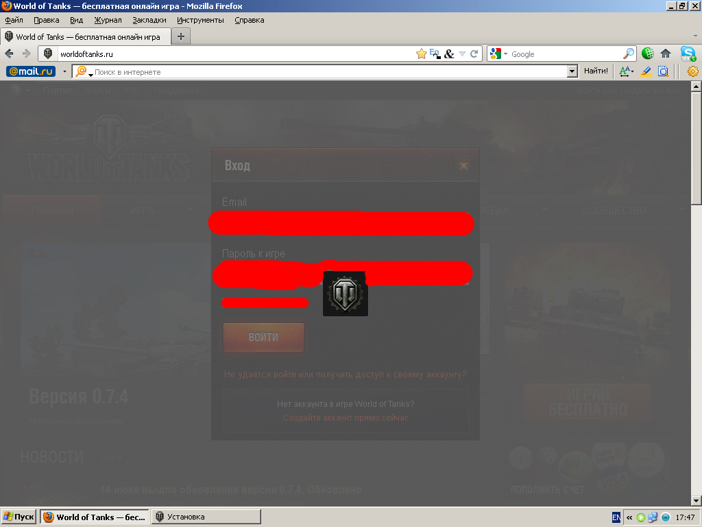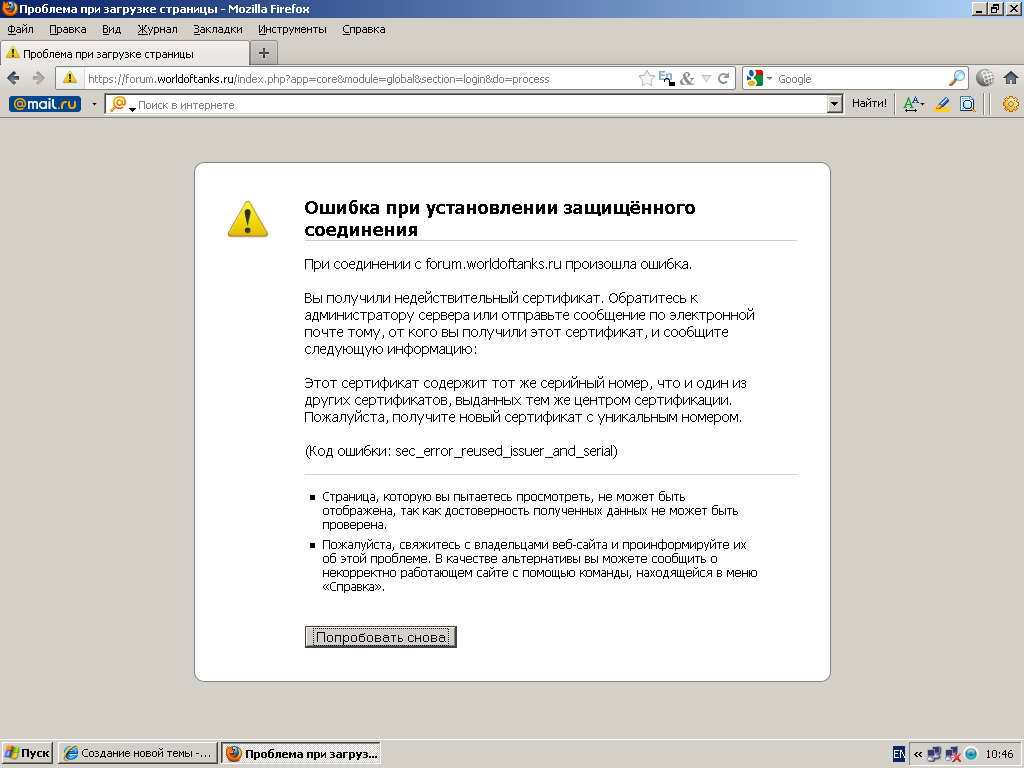 это началось после того когда я почистил кеш, куки ,историю журнала! когда захожу через мозилу на сайт ВОТ ввожу маил, пароль и кнопку войти, колесо крутится безконечно (крутилось больше суток)!!! http://cdn-frm-eu.wargaming.net/wot/ru/uploads/monthly_06_2012/post-2107918-0-58705600-1339746203_thumb.jpg когда захожу через мозилу на форум ВОТ ввожу маил , пароль и кнопку войти, выдает ошибку! http://cdn-frm-eu.wargaming.net/wot/ru/uploads/monthly_06_2012/post-2107918-0-22936500-1339746437_thumb.jpg что мне делать ??? сейчас сижу на internet explorer все нормально заходит, только очень долго!
