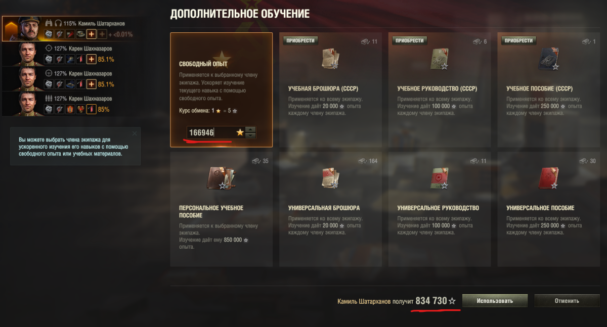 Вроде как после обновления интерфейса такого нет нигде. Если хочешь посмотреть, сколько опыта надо, то можешь попробовать перейти в раздел ускоренного обучения и нажать на "Свободный опыт". Там будут циферки как раз. В окошке свободного опыта будет количество именно свободного опыта, который ты вложишь. А снизу будет написано, сколько опыта член получит при обучении. Такая разница, потому что свободка переводится в опыт экипажа по курсу 1 к 5 Смотреть тебе надо на нижние циферки, по сути столько опыта нужно получить за бои. Тут опыт показывается именно для прокачки текущего перка до 100%. Но можешь стрелочками менять количество опыта, и смотреть, сколько это по факту будет процентов (отображается у иконки члена) https://forum-mt-prod.lesta.ru/monthly_01_2025/post-217484-0-45398100-1737907257_thumb.png