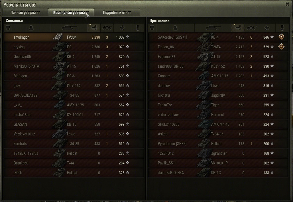 Да, скорее всего порежут красавицу. У меня на ней за 940 боёв процент побед 55% (только рандом). Можно и поболее набить, да надоела уже. Вкачал фв 8 уровня, думал, что-то похожее, да фик там, *** полная. В Ласвиле за перевалом 304 незаменима, угу. Как и на Вестфилде или в Заполярье. =) http://cdn-frm-eu.wargaming.net/wot/ru/uploads/monthly_10_2013/post-2113633-0-07872600-1380883960_thumb.jpg http://cdn-frm-eu.wargaming.net/wot/ru/uploads/monthly_10_2013/post-2113633-0-68601700-1380883969_thumb.jpg Мастера здесь взял. Остался один против кв4 ваншотного и барабанщика фулового. Затащил. Стою обычно в центре городка на нижней респе, держу (вернее, гуслю) сразу три направления. =)