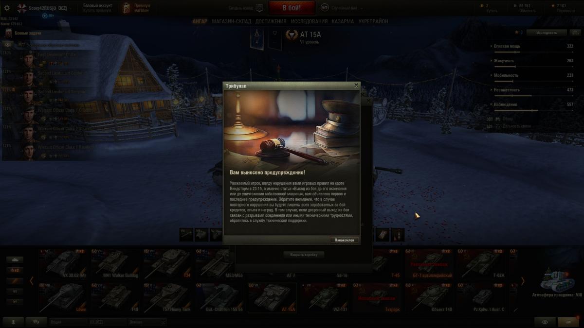 Буквально в конце боя рубанулся интернет, захожу в игру и вижу "последнее предупреждение", что за нелепая дрянь? я не выходил из боя намеренно, мы уже добивали последние 2 танка, как случился обрыв, ещё очень сильно раздражает тот момент, когда понимаешь что инет отвалился - игра начинает оооочень долго думать перед тем как выкинуть в главное меню, понятно же уже что не соединит, так чего она ждёт то? В кораблях если такое случается - выбрасывает в главное меню без всяких длительных задержек, так что сразу в бой заходишь. Очень неприятно, когда наносил урон и шел к победе, а затем дисконнект и такая табличка... Такие дела.