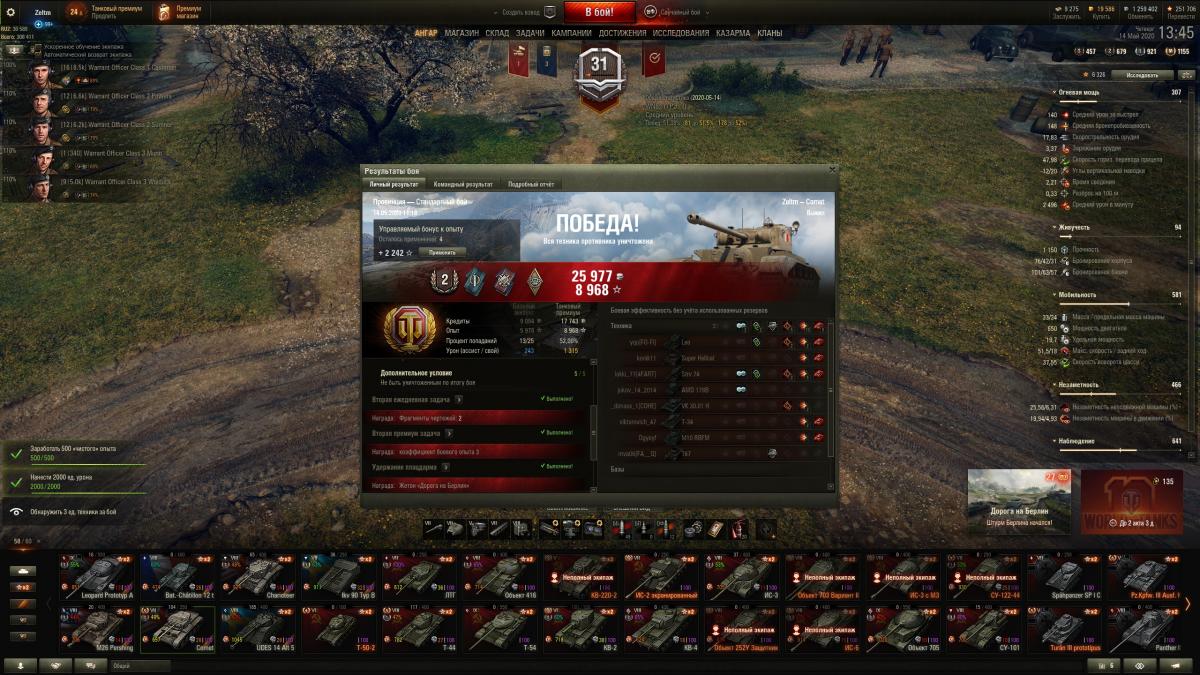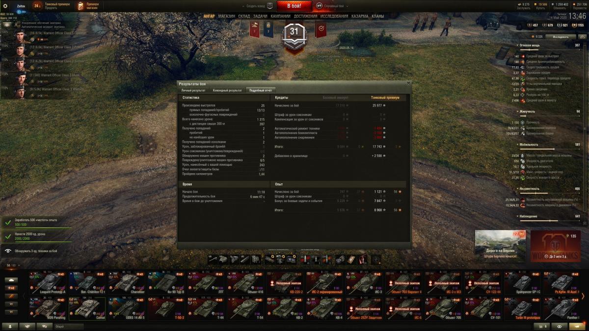 Подскажите, это баг, обман или просто коэффициенты складываются/перемножаются каким-то хитрым способом? Пример трёх боёв на одном и том же танке (на момент написания действует бонус в виде задач на х2 за каждую победу, если попал в топ-7 по опыту): 1 - победил и сбил х2 за первую победу в день, получил 506 чистого опыта и по итогу 1012 без према и 1518 с премом - тут всё ясно; 2 - победил и попал в топ-10, выполнил задачу "Дополнительный опыт" на х5, получил 478 чистого опыта и по итогу 2390/3585 - так же без вопросов; 3 - победил и попал в топ-3 как по опыту, так и по урону, выполнил как предыдущие задачи на х2 и х5, так ещё и вторую ежедневную премиум задачу на х3, получил 747 чистого опыта и по итогу 5978/8968 - и вот тут уже не понятно, что происходит с коэффициентами, т.к. даже если они не перемножаются, а только складываются, то как минимум должно было получиться х10, а судя по цифрам получаем всего х8... Такое ощущение, что где то нае... обманули в общем!