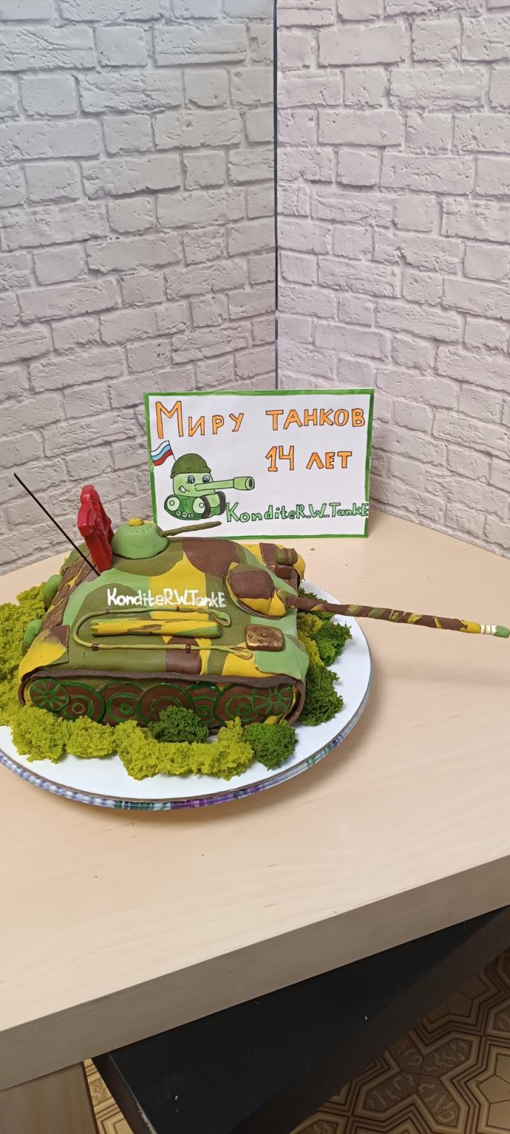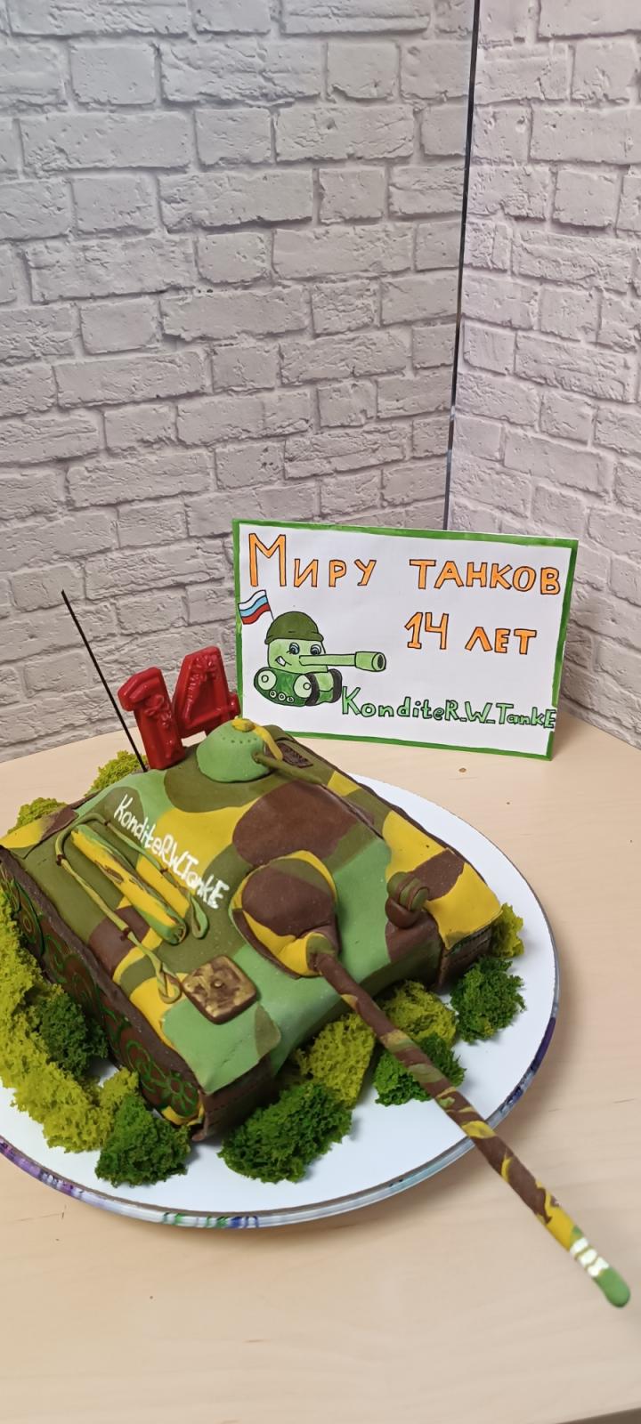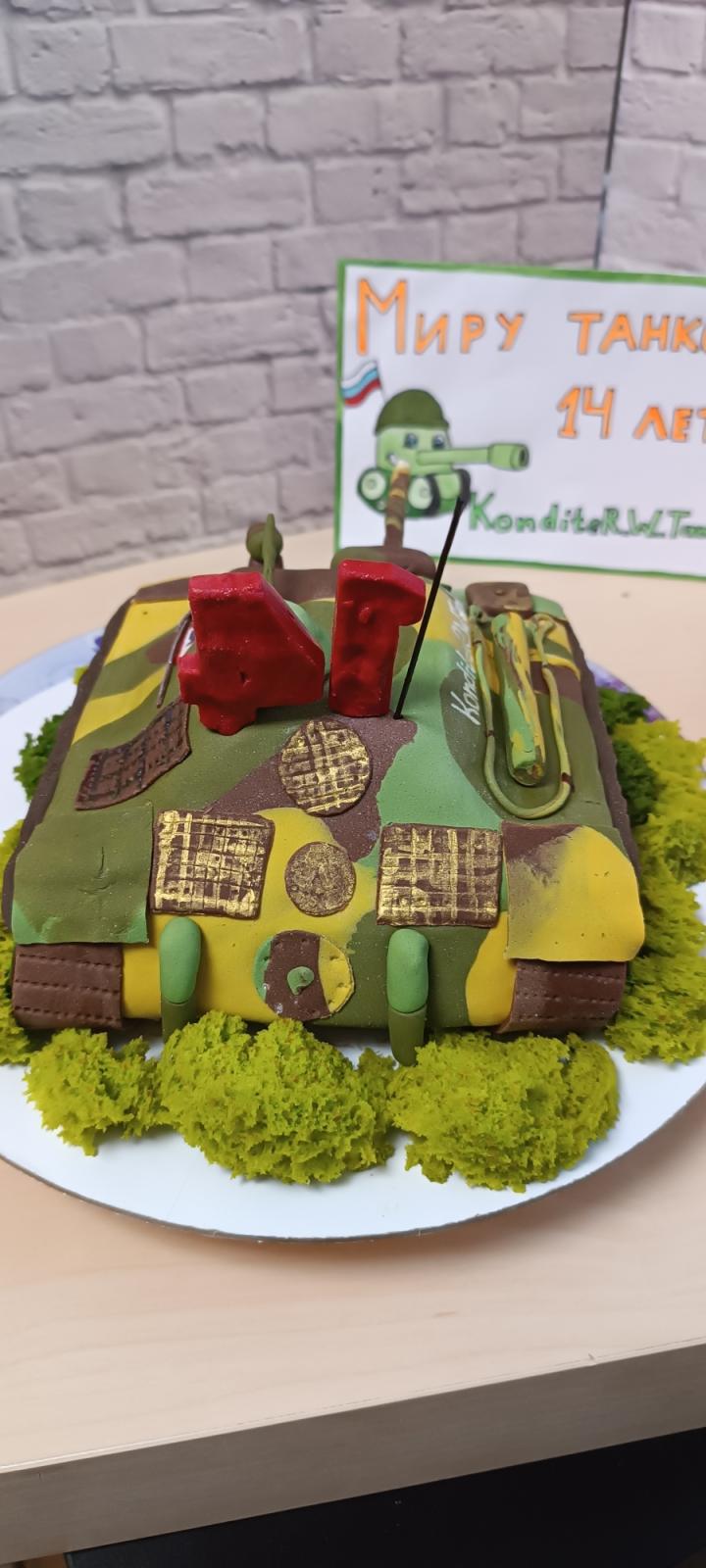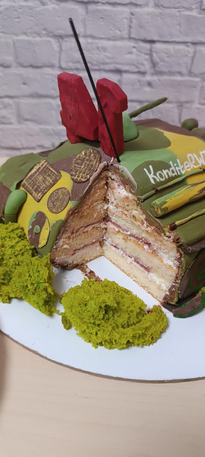 Танк е25 пт ( в простонародии "блоха"https://forum-mt-prod.lesta.ru/emoticons/Smile_blinky.gif. Приготовлен из бисквита, крем чиза и клубничного конфи. Покрыт ганашом на молочном шоколаде. И завершающее покрытие мастика. Ну и маскировочная растительность бисквитный мох). И конечно приготовлен с любовью и хорошим настроением!) всем удачи и успехов!