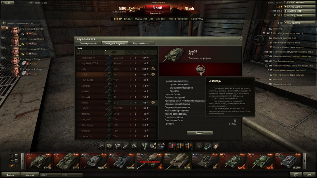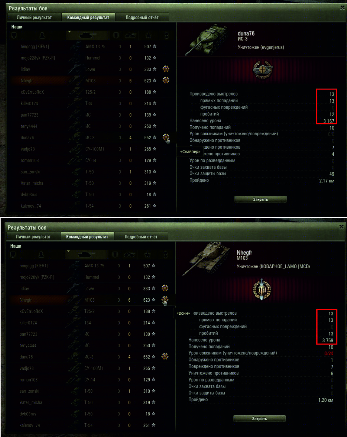 Не подумайте что мне жалко медальку, я просто хочу понять принцип по которому её выдали ) Вопрос в картинках: 1) мои итоги боя http://cdn-frm-eu.wargaming.net/wot/ru/uploads/monthly_10_2012/post-2162659-0-72655800-1349577971_thumb.jpg 2) итоги боя союзника на ИС-3 http://cdn-frm-eu.wargaming.net/wot/ru/uploads/monthly_10_2012/post-2162659-0-34290000-1349577998_thumb.jpg 3) описание медали "Снайпер" http://cdn-frm-eu.wargaming.net/wot/ru/uploads/monthly_10_2012/post-2162659-0-40805400-1349578020_thumb.jpg 4) сравнение показателей у Ис3 и М103 http://cdn-frm-eu.wargaming.net/wot/ru/uploads/monthly_10_2012/post-2162659-0-62099900-1349578043_thumb.jpg Итого: из описания медали получается что она должна была достаться мне. Единственный пункт по которому она могла отойти ИС-3 - это если его непробитие "потенциально" нанесло 592 урона (это разница между нанесённым мной и им уроном)... Вот скажите: почему медаль досталась ему? Это баг или фича? :)