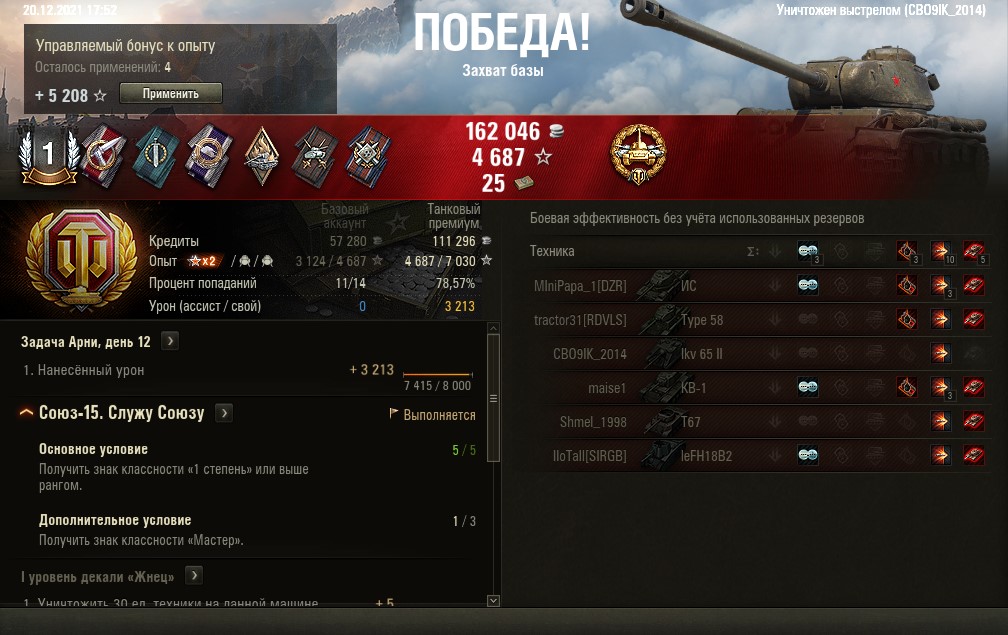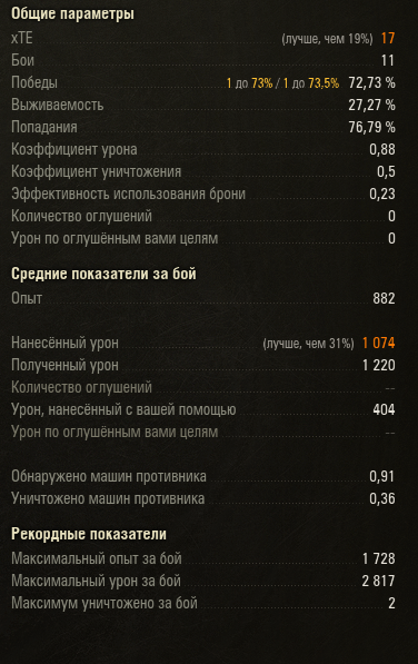 Не знаю, может быть льгота не кончилась на нём. 29 боёв 59%. Я просто не очень часто играю. Пока нравиться. На схожих Д-25 редко кто пробивается толком... тут же прям на вылет. КВ-5 вот убила, хотя он тараном лез. В сиську и в борт. Тоже ББ. В среднем получается 70-80К за бой... Учитывая мои криворучки, да +29% новогодних за ёлку, но радует, однако. С 9-ми пока-что тоже бодро соревнуется. На том же ИС-6 такое не проходит. Скорее всего в дно всё же опустит балансер, тут уж от бойца ничего не зависит в этой игре, если в рандоме играть и соло.