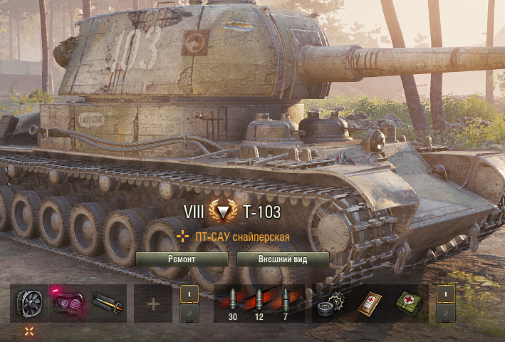 Вентилятор, оптика обычна, досылатель. Доп. спец. слот по полевой модернизации установлен на обзор. Обзор = 470 м. Вполне хватает для высвета всего крупного, среднего и даже мелкого. Сведения хватает, если экипаж хороший + вентилятор трофейный. Светится Т-103 как маяк. Не ПТ это, а что-то типа амер. ТТ Т34, либо ПТ Т30. Слегка привыкнуть и просто огонь. --------------------------