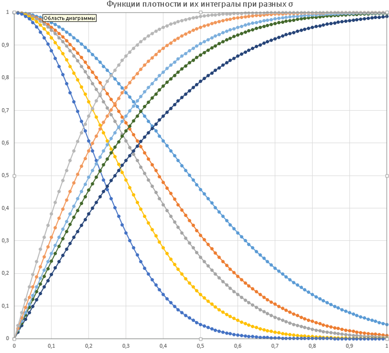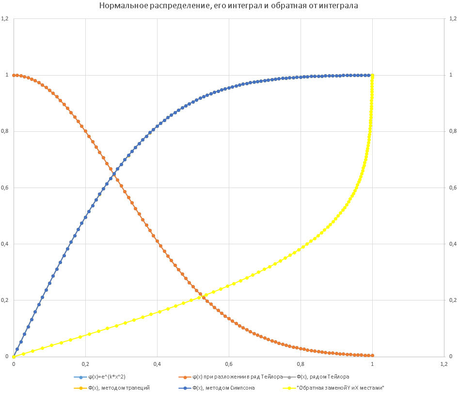 https://forum-mt-prod.lesta.ru/monthly_10_2025/post-22519702-0-97575200-1759727806.png Реализация трёх вариантов вычисления интеграла (методом трапеций, методом Симпсона (парабол), и разложением в ряд Маклорена) приведена в Excel-файле: http://cdn-frm-ru.lesta.ru/4.6l/style_extra/mime_types/doc.gif Вычисление интеграла 3 способами.xlsx 49,36К Функция на исследуемом отрезке рассматривается как сумма простых функций fi(x), каждая со своим коэффициентом aiт.е.: https://forum-mt-prod.lesta.ru/monthly_10_2025/post-22519702-0-48104000-1759792636.png Например, в виде многочлена: https://forum-mt-prod.lesta.ru/monthly_10_2025/post-22519702-0-88913200-1759792713.png В этом случае, взяв значения n-точек графика (xi, yi) и подставив их в уравнение вида: https://forum-mt-prod.lesta.ru/monthly_10_2025/post-22519702-0-85136800-1759792796.png Мы получим матрицу, решив которую мы найдём коэффициенты ai Решение возможно различными методиками – я для решения использовал метод Гаусса (макрос в xlsm-файле - https://cloud.mail.ru/public/Q5rV/NU2C2ubwd). Вместо функций xn можно подставлять и другие элементарные математические функции (1/x, Корень(x), Ln(x), ex, и т.д.) если вы видите по графику что эти функции больше подходят. Для случая с поиском функции R(x) для нормального распределения подобрать одно короткое уравнение для всего множества значений не удаётся, т.к. график при приближении к 1 резко стремится вверх (если бы мы рассматривали весь диапазон чисел, а не ограничивались значениями от 0 до 1 то график бы вообще стремился к бесконечности) и для получения значений с требуемой точностью потребуется многочлен как минимум из 25-30 элементов (я для пробы подобрал функцию по 16-ти точкам и даже с таким количеством элементов погрешность вблизи единицы достигала 0,05 (а это многовато – при проверке на графике нормального распределения эти погрешности заметны (см. на рисунке - R(x)=0,375671592765802*x+0,14110597611776*x^3-3,12888304182395*x^5+92,0450211965136*x^7-1440,47820247473*x^9+13983,7655249723*x^11-90454,7355840174*x^13+406763,967960942*x^15-1303717,17055792*x^17+3015459,36369667*x^19-5040848,11728308*x^21+6027759,54399308*x^23-5023191,85046759*x^25+2768931,5365855*x^27-906904,212700489*x^29+133569,954118672*x^31). https://forum-mt-prod.lesta.ru/monthly_10_2025/post-22519702-0-58472400-1759793260.png Поэтому, чтобы уравнение было коротким (дабы сервер игры не тратил много ресурсов на длинные вычисления), его следует разбить на несколько отрезков – в этом случае каждый из отрезков можно подобрать более точно. Но для того чтобы отрезки плавно переходили из одного в другой (без изломов/перегибов), следует в точке перехода подбирать одинаковую производную – тогда линии будут соединяться под одним углом (без излома). Например, на отрезке от 0,75 до 0,9 я использовал разложение по 3 точкам и двум производным (одну в начальной, а другую в конечной точке отрезка): https://forum-mt-prod.lesta.ru/monthly_10_2025/post-22519702-0-09566500-1759793444.png Производные вычислены благодаря второму свойству обратной функции.