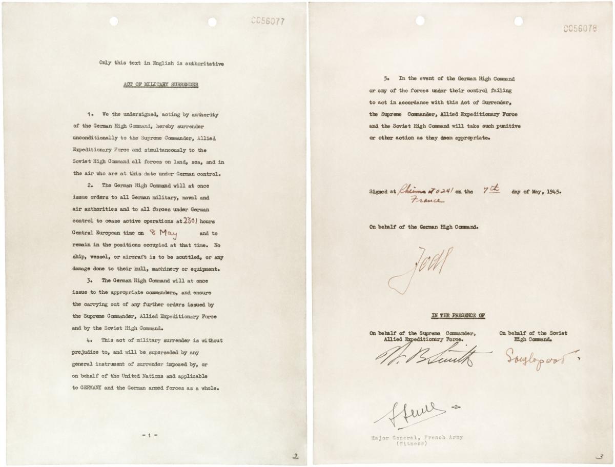 8 мая 1945 года в предместье Берлина Карсхорсте в 22 часа 43 минуты по центрально-европейскому времени (9 мая в 0:43 по московскому времени) был подписан окончательный Акт о безоговорочной капитуляции фашистской Германии и ее вооруженных сил. Но исторически берлинский акт о капитуляции не был первым. http://img694.imageshack.us/img694/9132/87998827.jpg Капитуляция Германии Когда советские войска окружили Берлин, перед военным руководством Третьего рейха встал вопрос о сохранении остатков Германии. Это было возможным, лишь избежав безоговорочной капитуляции. Тогда было принято решение капитулировать только перед англо-американскими войсками, но продолжать боевые действия против Красной Армии. Немцы послали представителей к союзникам для официального подтверждения капитуляции. В ночь на 7 мая во французском городе Реймсе был заключен акт о капитуляции Германии, согласно которому с 23 часов 8 мая боевые действия прекращались на всех фронтах. В протоколе оговаривалось, что он не является всеобъемлющим договором о капитуляции Германии и ее вооруженных сил. Однако Советский Союз выдвигал требование безоговорочной капитуляции как единственного условия окончания войны. Сталин считал подписание акта в Реймсе лишь предварительным протоколом и был недоволен, что акт о капитуляции Германии был подписан во Франции, а не в столице государства-агрессора. Тем более, что боевые действия на советско-германском фронте все еще продолжались. По настоянию руководства СССР, представители союзников повторно собрались уже в Берлине и совместно с советской стороной 8 мая 1945 года подписали еще один Акт о капитуляции Германии. Стороны условились, что первый акт будет именоваться предварительным, а второй – окончательным. Окончательный Акт о безоговорочной капитуляции Германии и ее вооруженных сил от имени германского вермахта подписали генерал-фельдмаршал В.Кейтель, главнокомандующий ВМС адмирал Фон Фридебург, генерал-полковник авиации Г.Штумпф. СССР представлял заместитель Верховного главнокомандующего маршал Советского Союза Г.Жуков, союзников – главный маршал авиации Великобритании А.Теддер. В качестве свидетелей присутствовали генерал армии США Спаатс и главнокомандующий французской армией генерал Тассиньи. http://img713.imageshack.us/img713/224/02ce9d1a03c706xl.jpg Подписание Акта о безоговорочной капитуляции Германии в Реймсе. Шестой слева в дальнем ряду – Иван Суслопаров (подписывает документ) Торжественное подписание акта состоялось под председательством маршала Жукова, а сама церемония подписания проходила в здании военно-инженерного училища, где был подготовлен специальный зал, украшенный государственными флагами СССР, США, Англии и Франции. За главным столом располагались представители союзных держав. В зале присутствовали советские генералы, войска которых брали Берлин, а также журналисты многих стран. После безоговорочной капитуляции Германии правительство вермахта было распущено, а немецкие войска на советско-германском фронте начали складывать оружие. Всего в период с 9 по 17 мая Красная Армия взяла в плен на основе акта о капитуляции около 1,5 млн. солдат и офицеров противника и 101 генерала. Так закончилась Великая Отечественная война советского народа. В СССР о капитуляции Германии было объявлено в ночь на 9 мая 1945 года, и по приказу И.Сталина в этот день в Москве