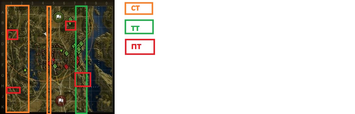 По сколько у нас очень разнообразные карты и не каждый игрок знает куда ехать на своей технике,я предлагаю следующий вариант,почему бы не сделать цветные разметки на карте для разной техники,чтобы каждый игрок знал в начале боя,куда ехать ему на ст или тт.в рандоме очень много людей не понимающих игры,причем это и к 10 лвл относиться...Людей нужно учить играть,если такая подсказка была бы с начала игры у всех,появилось бы большее кол-во людей,умеющих играть,если я не понятно объяснил,загружу изображение из гугла с редактором в пайнте,Надеюсь знающие и умеющие люди уже смогут реализовать мою идею более достойно http://cdn-frm-eu.wargaming.net/wot/ru/uploads/monthly_03_2016/post-2264491-0-51272800-1457347012_thumb.jpg