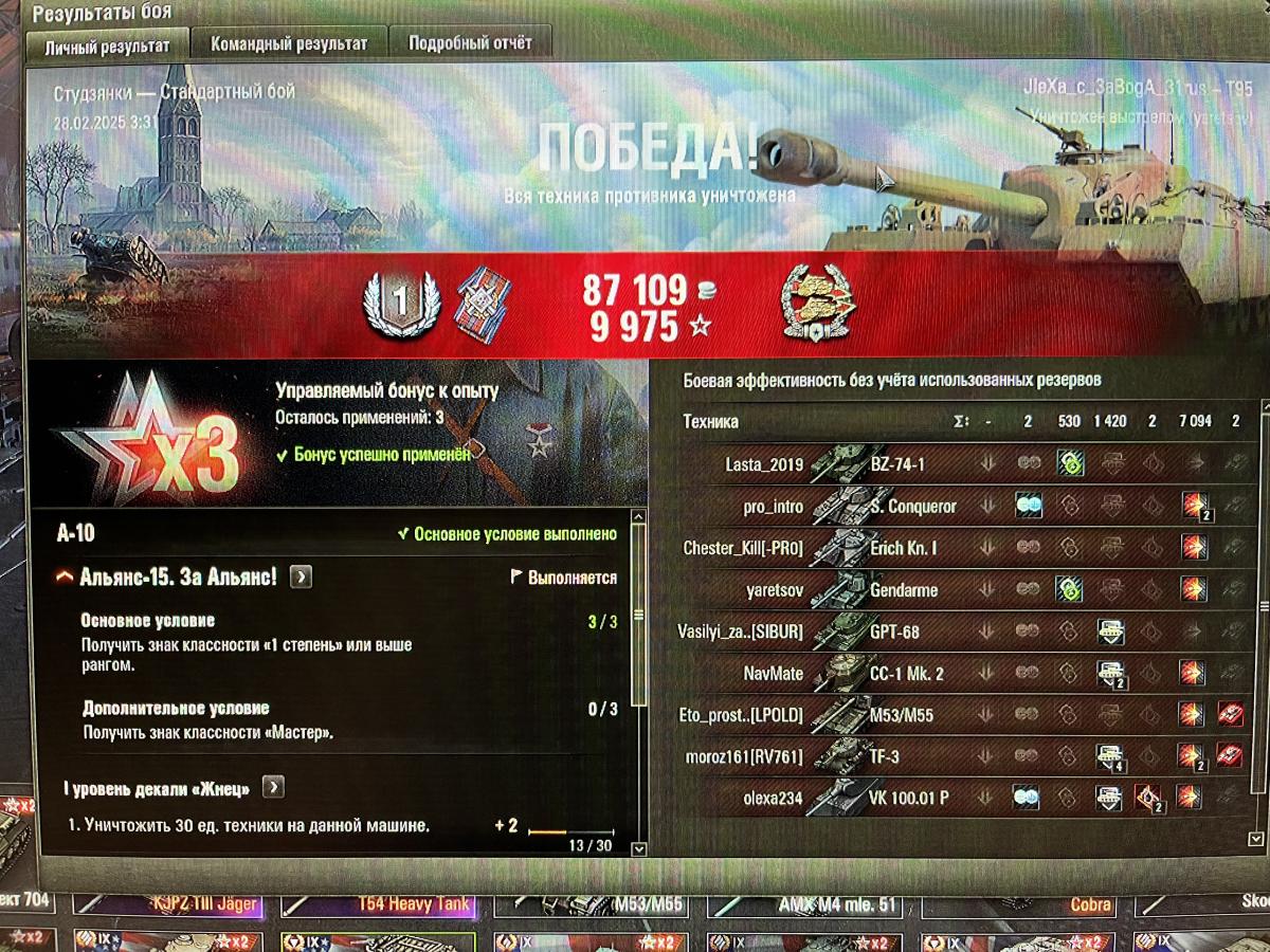 Наконец-то поддалась А-10. Мучался на 752, Аллигаторе ,потом вспомнил про 95 и с первого боя понял ,что на нем будет выполнить реальнее всего .Хватило 5 боев.Что удивительно основная часть задачи закрыта уроном,хотя я брал рассчет на танкование.Поехал на железку к тяжам ,далее к ним на базу где ждал Жандарм который меня и убил ,но фугас в его скворечник поставил точку в выполнении задачи