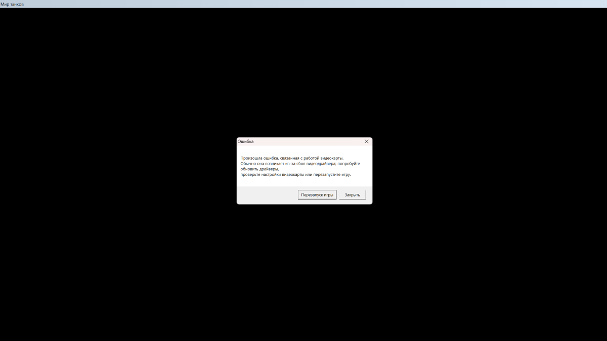 Здравствуйте! С выходом обновления приуроченного ко Дню рождения мира танков стала вылетать ошибка: "Произошла ошибка связанная с работой видеокарты." Происходит она во время загрузки клиента игры, доходит до середины и затем вылетает ошибка. В ЦПП обращался, мусолили проблему где-то 2-3 недели, что только с ними не делали, в результате написали что проблема решается - ждите. Вот проблема начала возникать в начале августа и уже сегодня середина ноября, и хотелось бы узнать она вообще как то решается? На каком этапе она и когда уже её пофиксят, а то скоро НГ и никаких продвижений нету