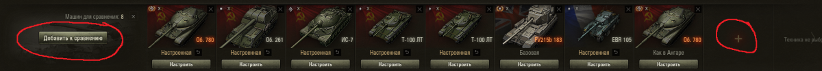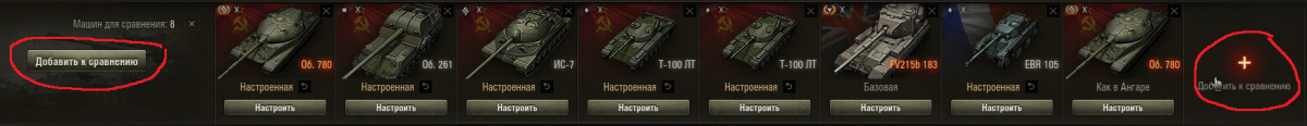 Чтоб 2 раза не вставать. В настройки машины, до сих пор, нет 2-го набора оборудования. Приходиться добавлять одну и ту же машину несколько раз, чтоб сравнить оборудование. Тут мы переходим к теме. Почему нельзя перемещать столбцы с техникой, так, чтоб нужные машины были рядам? Очень "удобно" сравнивать когда одна машина на одном экране, а другая на соседнем. Сидишь себе, крутишь ползунок взад-назад, глаза ломаешь. Сплошное удовольствие. Сложно сделать "плюс" ярким и добавить надпись как при наведение на "плюс" - перманентно? Сейчас так: Хотелось бы так: