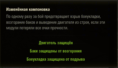 Интересует - как работает модуль "Изменённая компоновка"? На танке установлен модуль "Изменённая компоновка" и "Автоматический огнетушитель". При на ведение на иконку модуля "Изменённая компоновка", в начале боя - вижу такое . Во время боя получаю дамаг, загораются баки и срабатывает "Автоматический огнетушитель". Навожусь на иконку модуля "Изменённая компоновка" и вижу такое . Возникает вопрос! А когда срабатывает модуль "Изменённая компоновка"? А как понять, что он сработал?