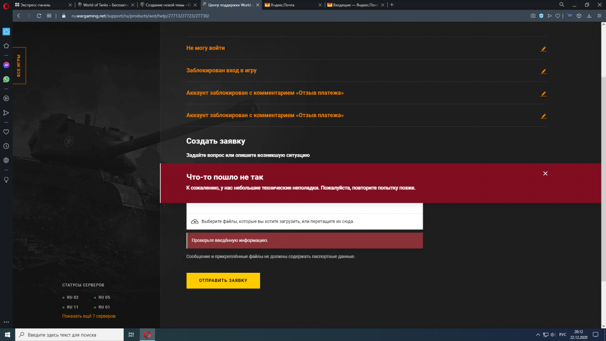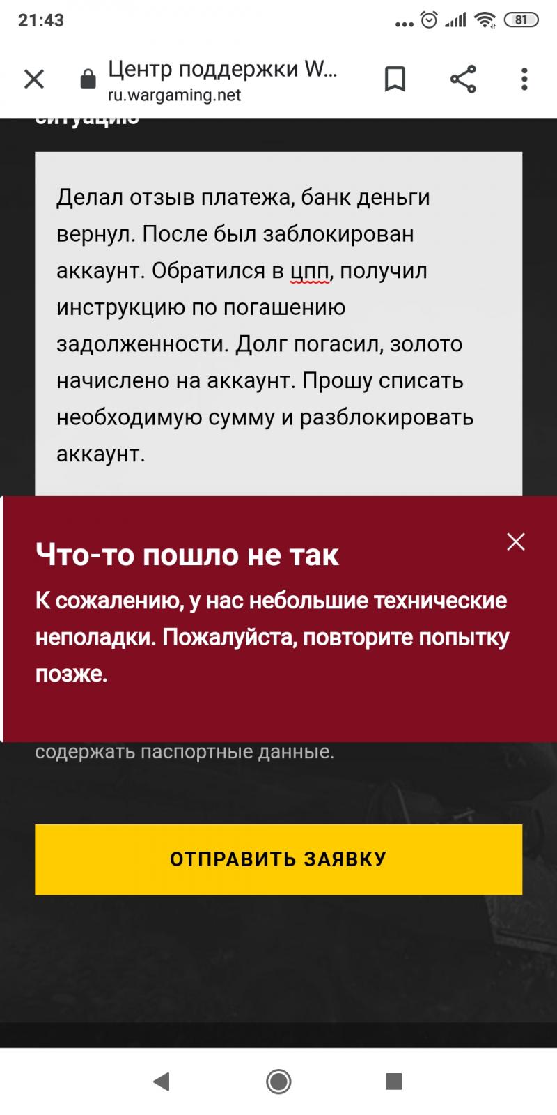 18 декабря аккаунт был заблокирован с меткой "отзыв платежа". В этот же день обратился в ЦПП, где дали инструкции по разблокировке. В этот же день оплатил долг как и говорилось в сообщении ЦПП. Вечером этого же дня ЦПП перестал работать (скрин) . По совету форумчан, создал заявку с "анонимного акк" 19 декабря. На сегодня 22.12 ответа нет, ни нигде. Разработчики находящийся на форуме, дайте информацию о том, как исправить ситуацию???!!!