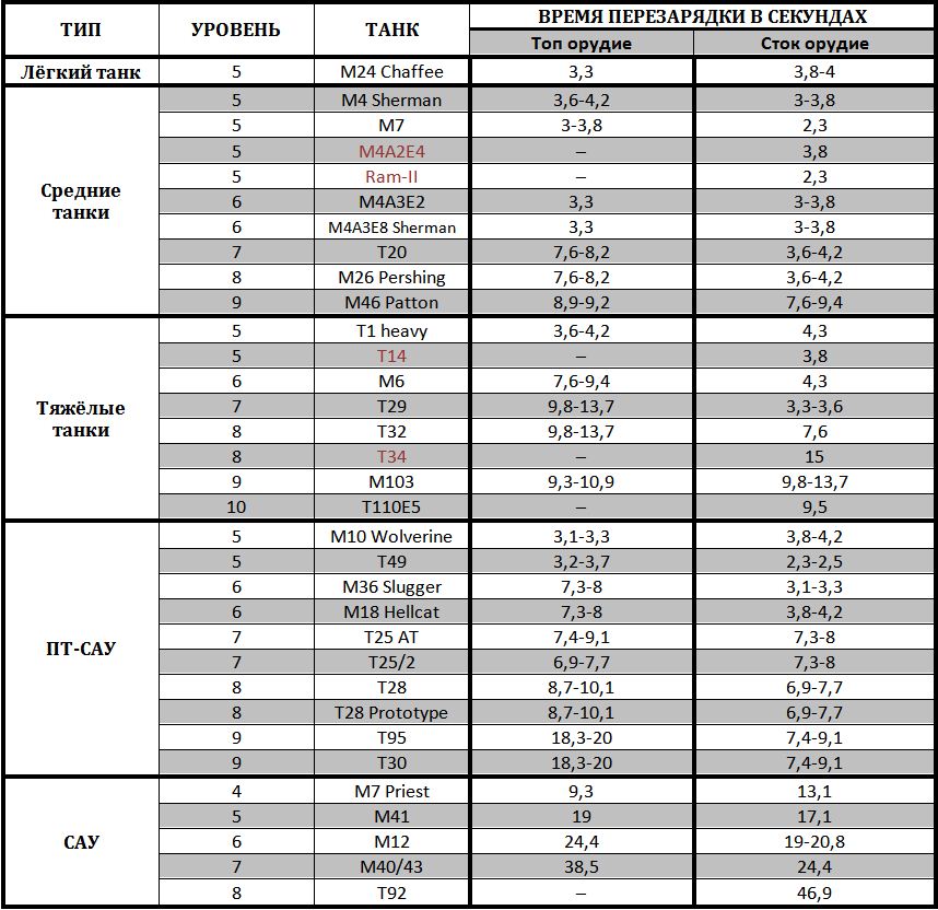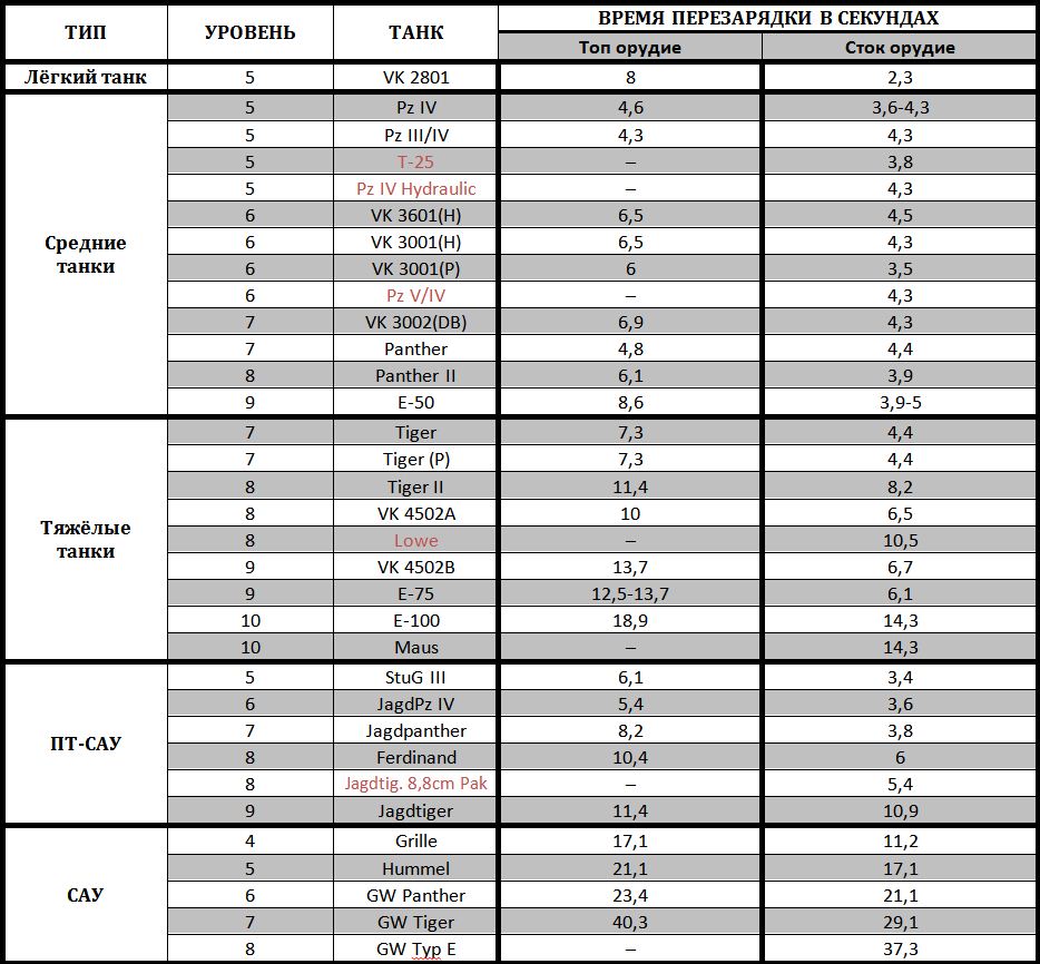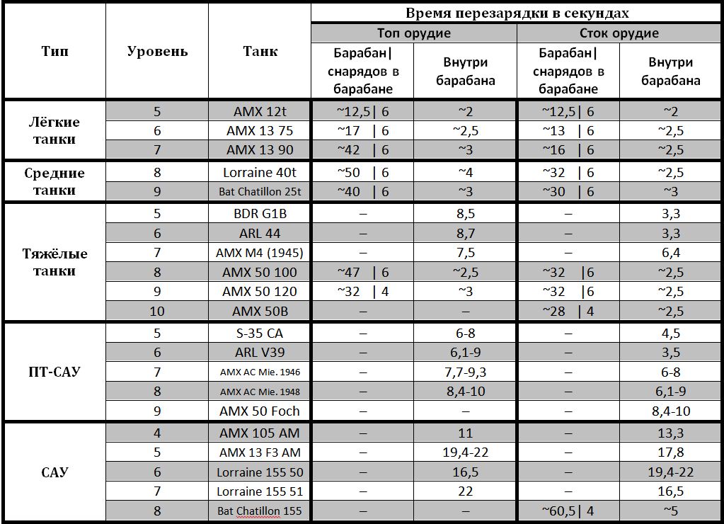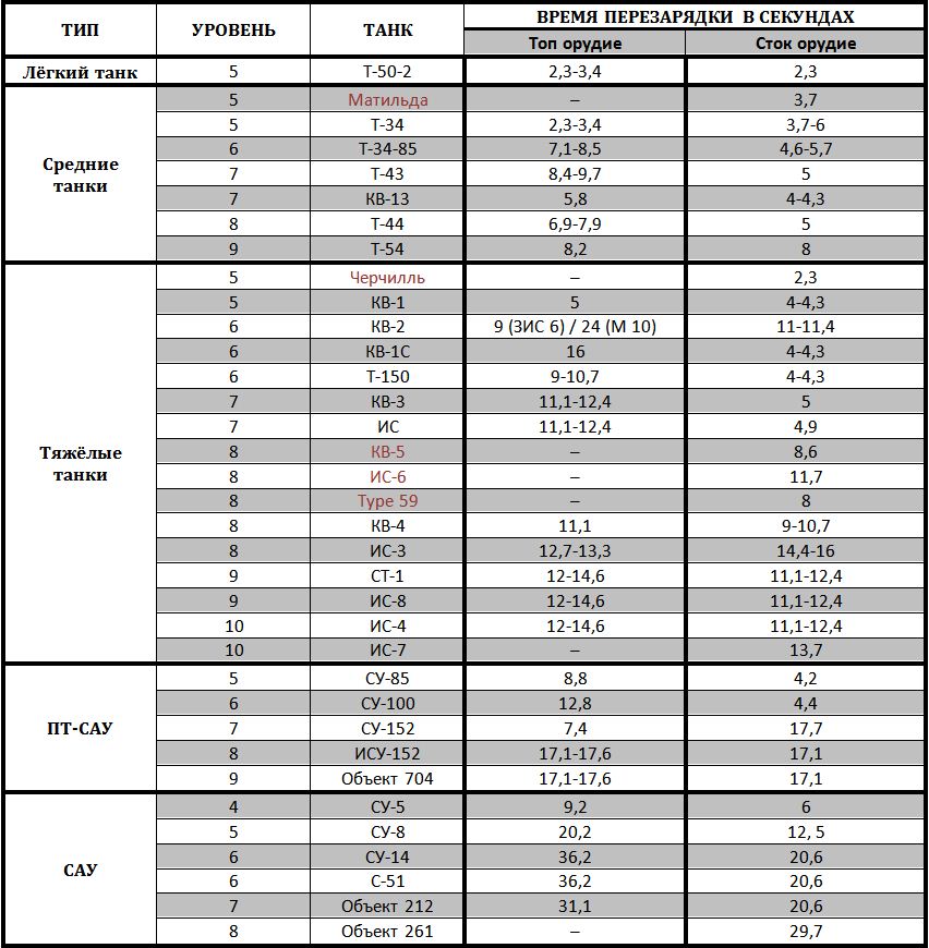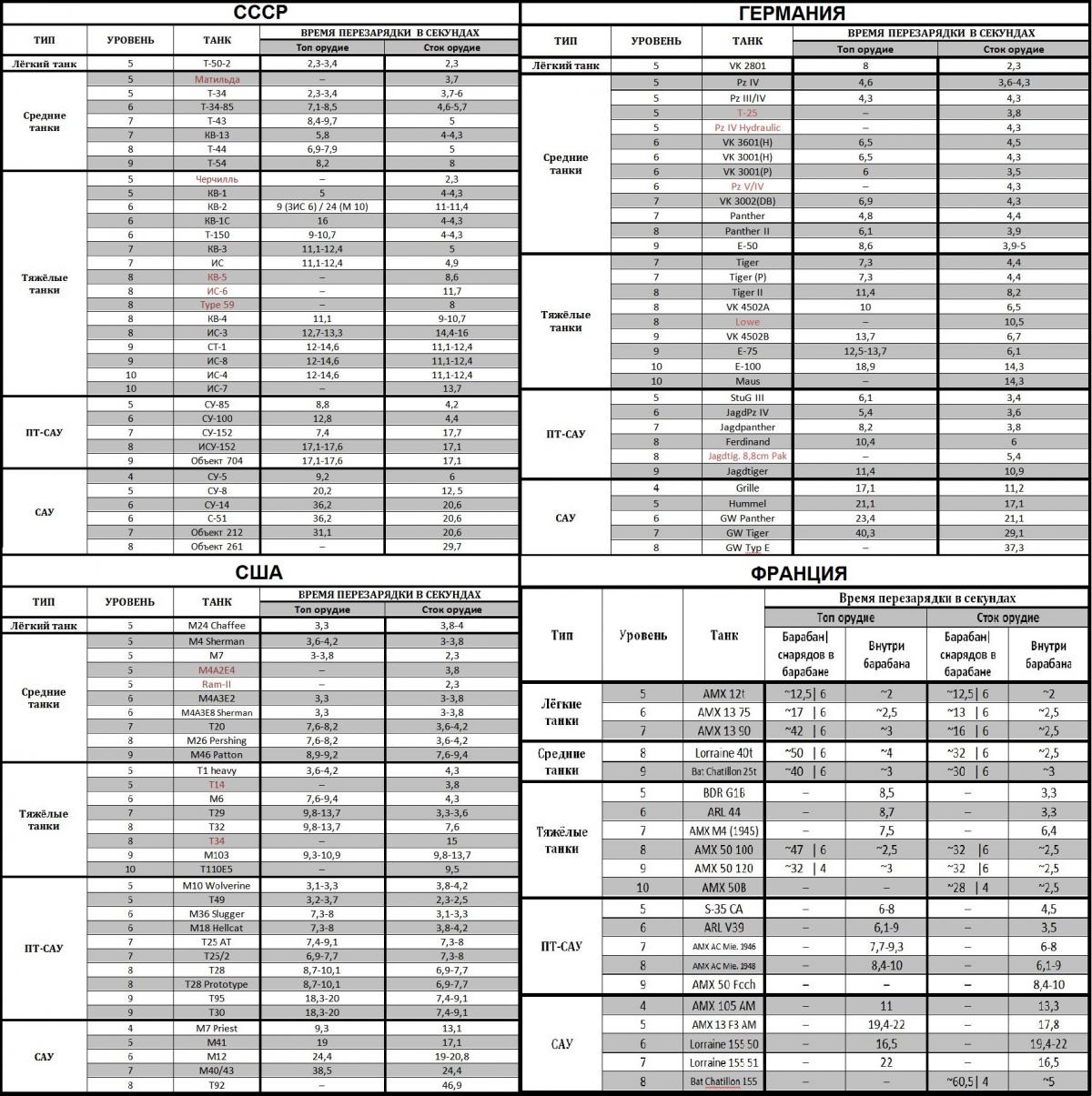 Доброго времени суток вам, товарищи! Наверное приятно было бы знать, сколько времени можно безопасно находиться перед дулом противника. Для этого нужно знать, сколько секунд перезаряжается тот или иной танк. Но к сожалению скорострельность, описанная в характеристиках орудий не даёт достаточно нужной информации. Да и на всех танках не поиграешь, так что прицелы с временем перезарядки не подходят. Именно поэтому я провёл некоторые исследования и расчёты и составил таблицы перезарядки всех танков всех наций начиная с пятого уровня! Вот некоторые особенности данных таблиц: ЭТО ПЕРВАЯ ВЕРСИЯ ТАБЛИЦЫ, но совместными усилиями можно составить таблицу с точной информацией. Все данные в таблицах приблизительные. Расчёт времени вёлся исходя из данных, написанных в описании орудий, частично бралась информация из форума. Так что могут быть ошибки. Если в танке был выбор топовых орудий, то выбиралось наиболее популярное, исходя из данных форума. Время перезарядки французских САУ и ПТ-САУ высчитывалось по данным 2 тестового сервера.Если вы найдёте здесь ошибки (они наверняка будут, так как в описании орудий информация часто неправильная), то, вместо того чтобы указывать на неточности просьба писать об этом в той же форме, как это и представлено в таблицах и указывайте пожалуйста, какое оборудование вы ставили. Таблицы будут редактироваться. Заранее спасибо. Я надеюсь что данные таблицы помогут вам на поле боя. Удачи! _________________________________________________________________________ Раз вы забраковали первый вариант таблиц, то представляю вам второй вариант таблиц: http://www.imageup.r...2/vse-nacii.jpg В этих таблицах учтены все факторы, влияющие на скорость перезарядки (досылатель, вентиляция, экипаж и навык "Боевое братство") и теперь время перезарядки представляет точные числа. Но эти таблицы придётся заполнять вручную, так что ПОЖАЛУЙСТА посодействуйте! Напишите время перезарядки своих танков в ангаре, это не займёт много времени, но вы поможете установить истину (не забудьте указать оборудование и % экипажа)! Эти таблицы, кроме того чтобы знать, сколько времени можно находиться на линии огня, нужны для установления наконец точных параметров для танков(в характеристиках орудий информация уж очень часто заведомо неверная).