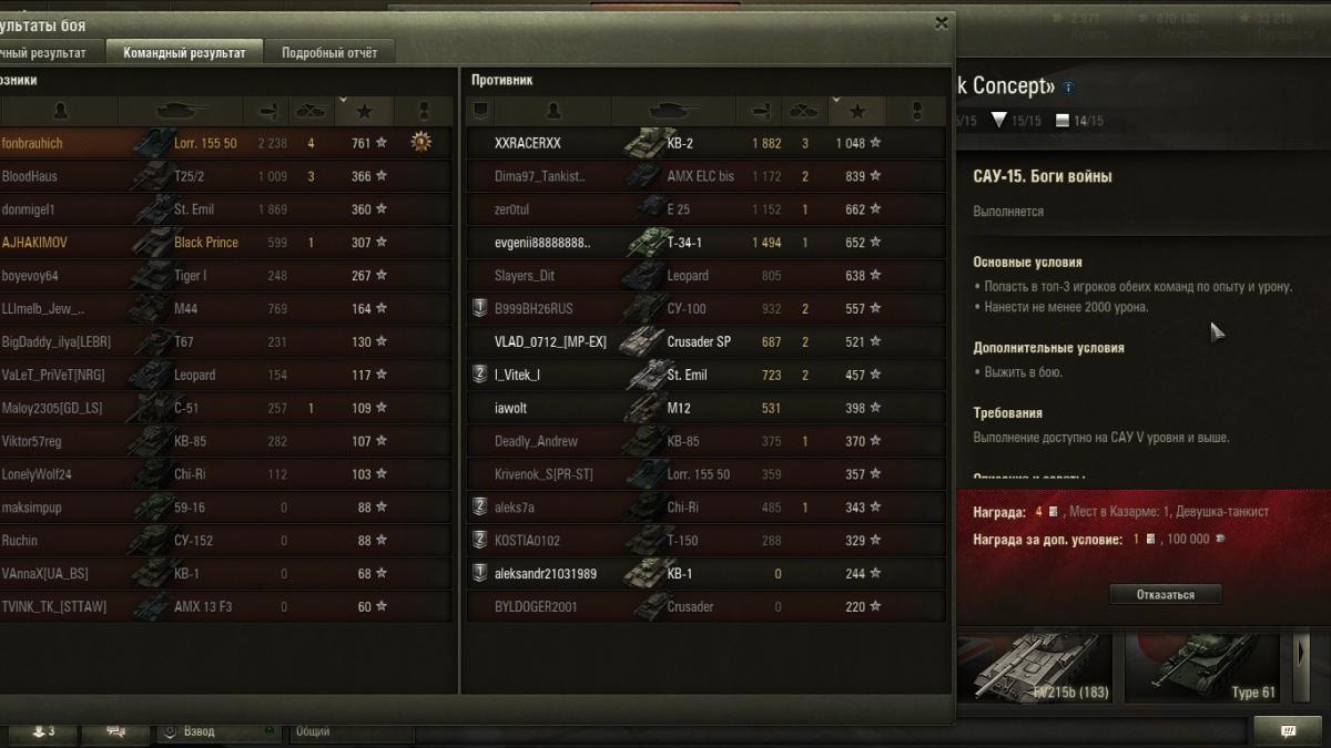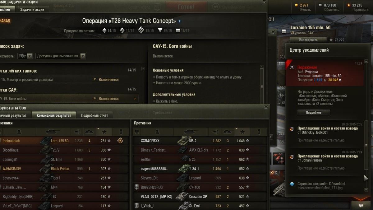 6. Добрый день, есть вот такой итог боя, выполнил задачу сау-15 попасть в топ-3 по урону,опыту для обеих команд и нанести 2000 урона........ и она не засчитана. Задача до сих пор висит не выполненной!!!! Если нужно могу прикрепить реплей. Последний скрин 1 мин. назад.Задача так и висит.