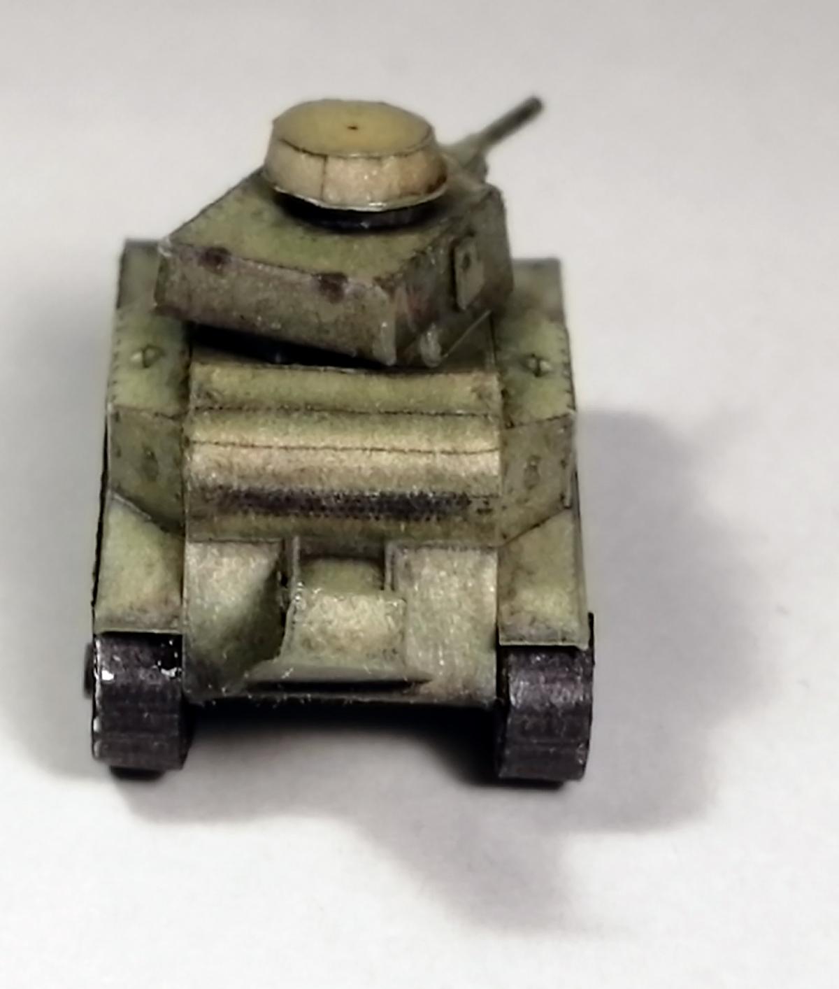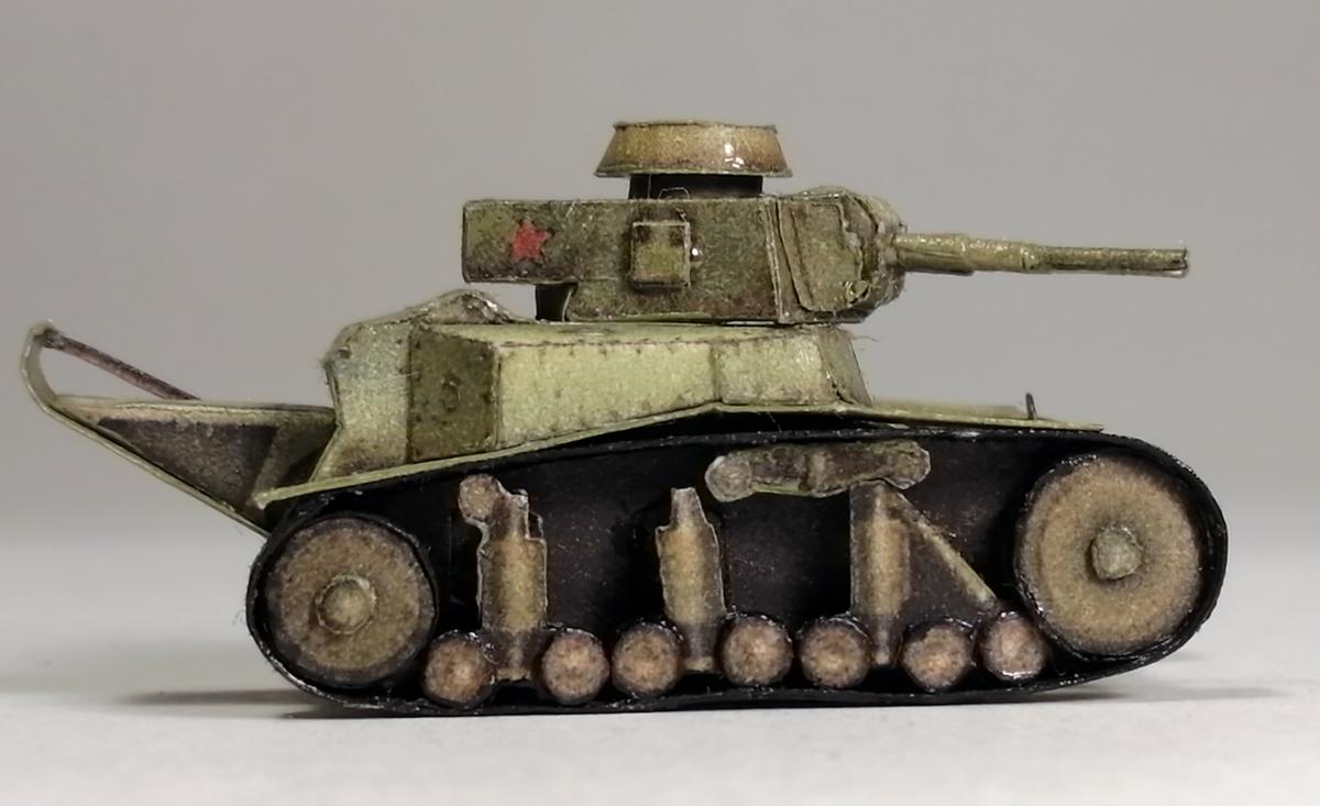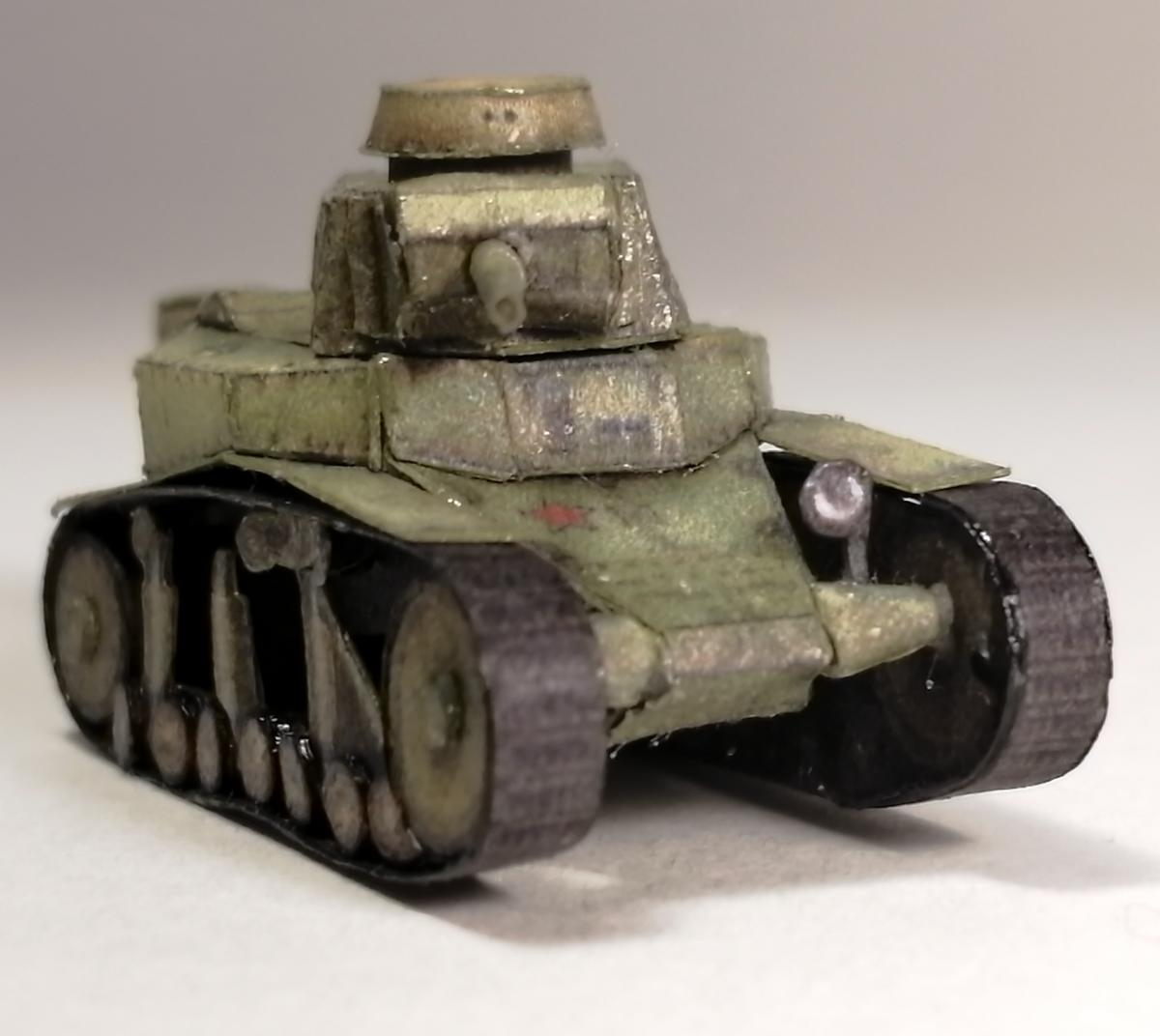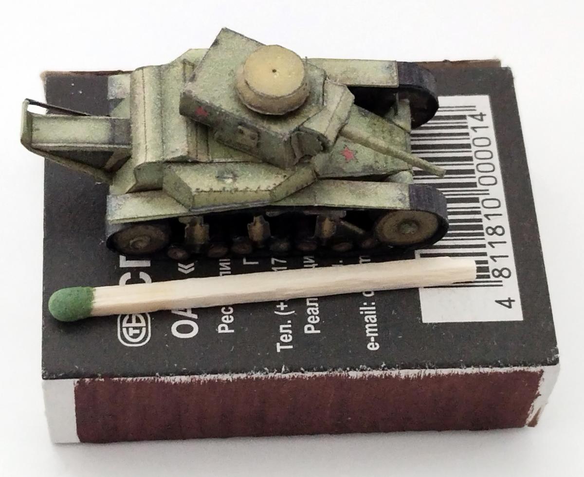 Приветствую. Посмотрел работы perepe4atnikov-а, и меня сразу заинтересовало: смогу ли я собрать модель,длиной не более 5 см. В итоге получилось что получилось. Это был мой первый опыт применения лака на бумажных моделях (скорее всего и последний), лак образует небольшие ворсинки, в некоторых местах образовались небольшие, но неуместные блестящие пятна. Косяк также в неуместно блестящей ходовой (перед обработкой лаком её стоило замаскировать, о чём я не подумал). также фото для понимания размера модели: P.S. линейка в миллиметрах.